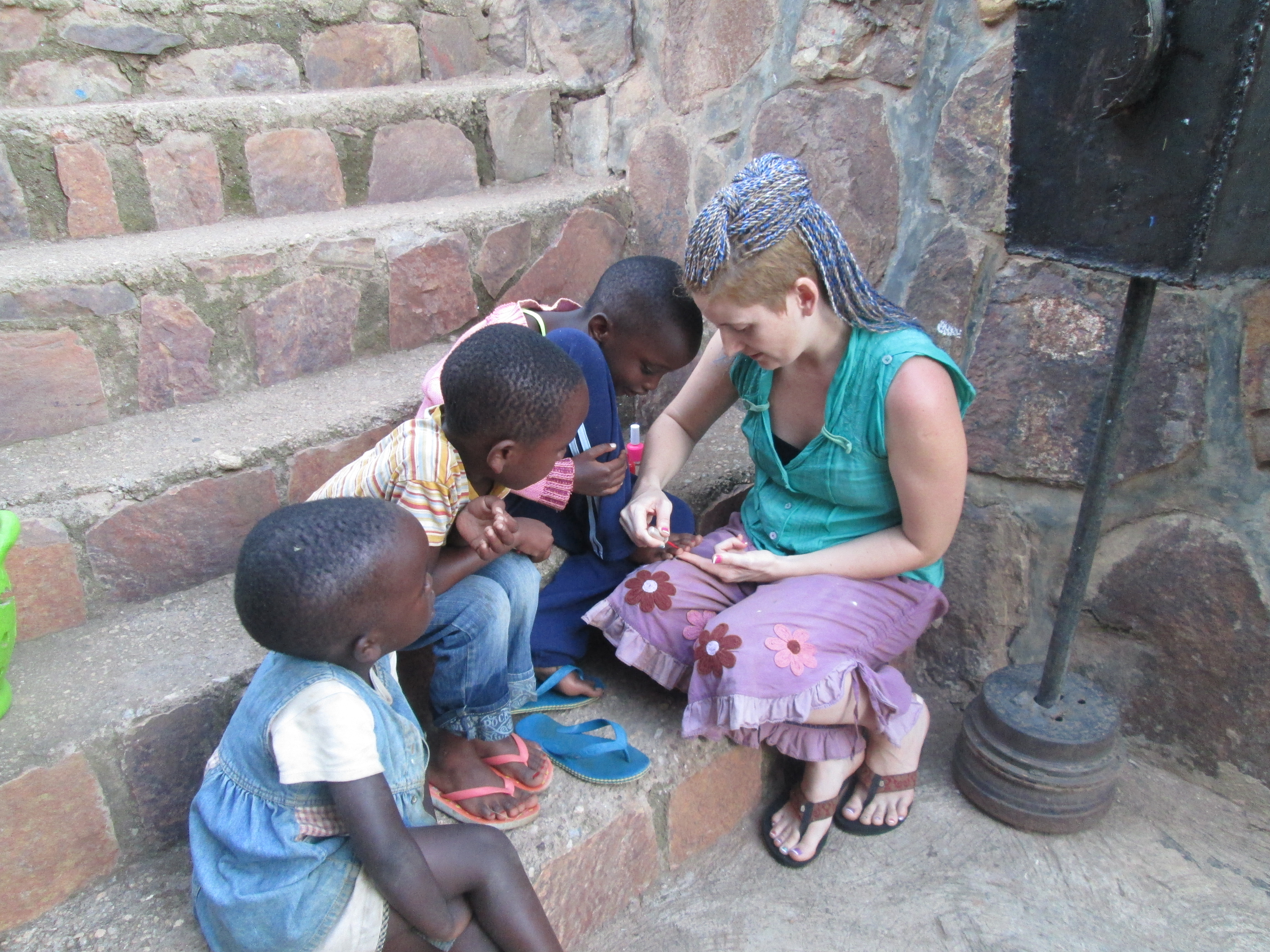 We sat on the steps together as one by one they had their fingers and then toes painted. One of them had missing nails and all of them had dirt caked into their little feet and nails. One little boy and two girls now had red and pink nails. The look on their faces as they admired there new fancy fingers and toes and posed for photos was so sweet.I am constantly reminded of my own beliefs that every little thing counts and makes a difference in the world. Three little children had a 30 min experience with me that brought us all  joy, happiness and laughter and that, especially here, changes us all forever.