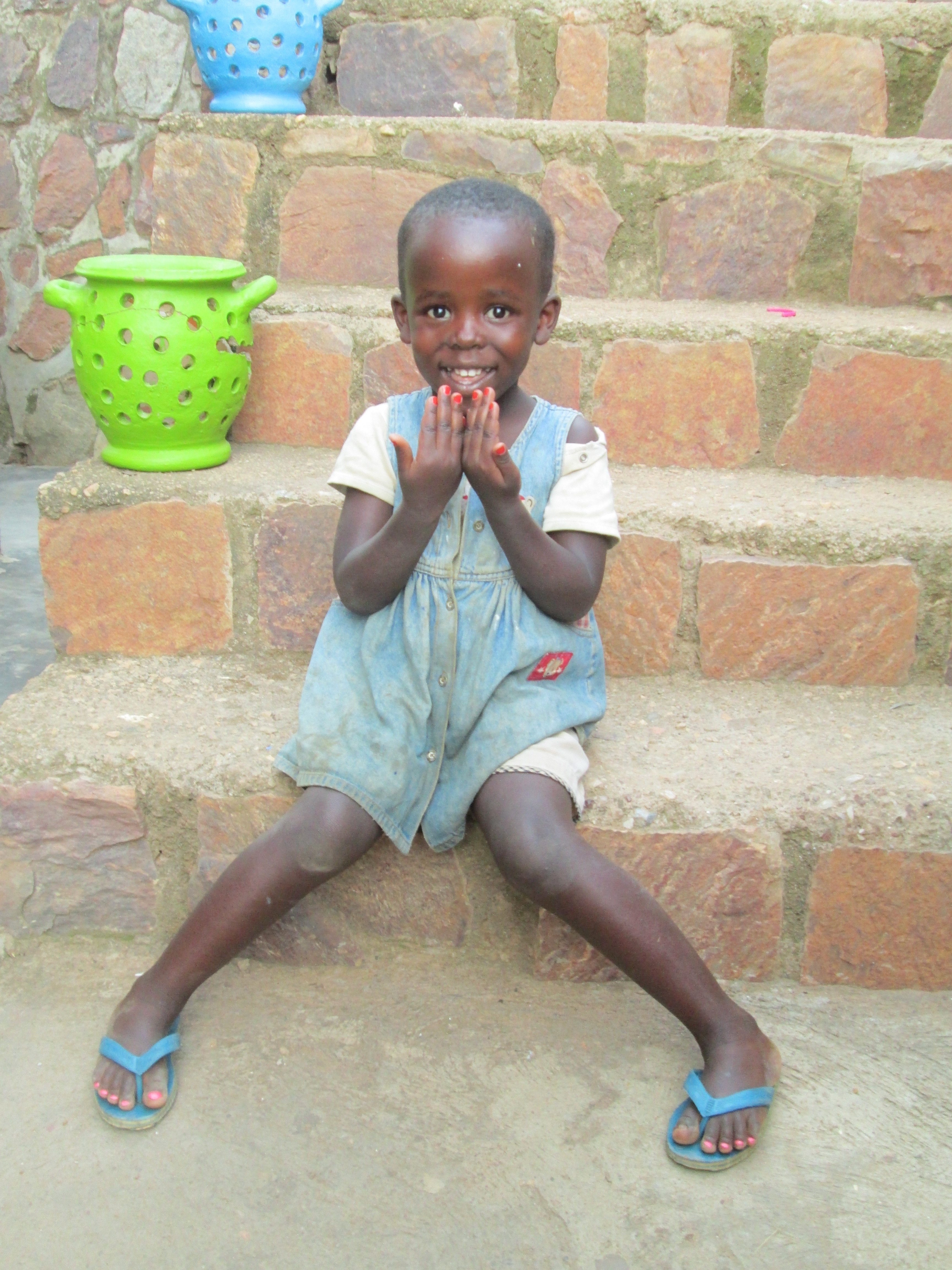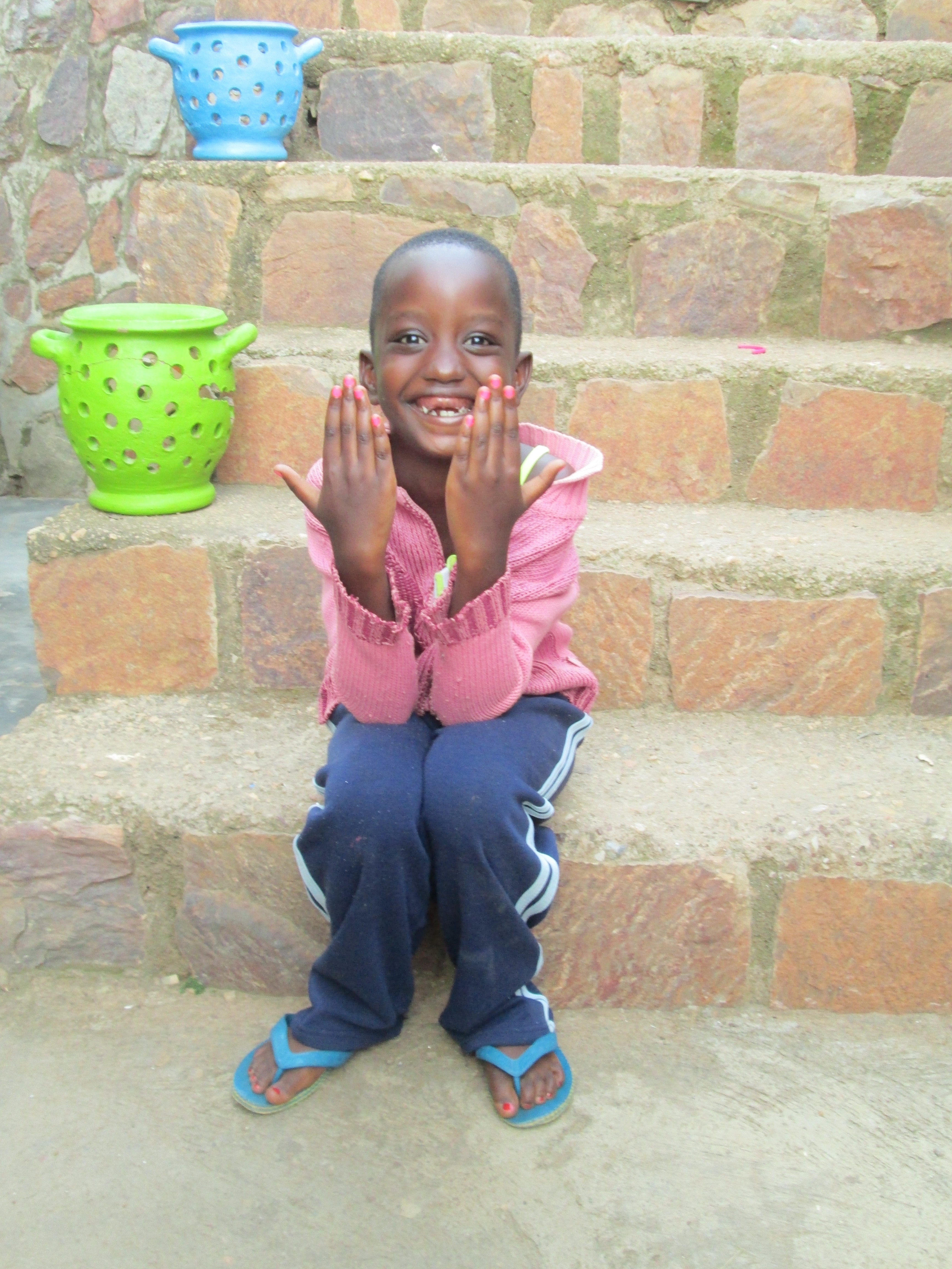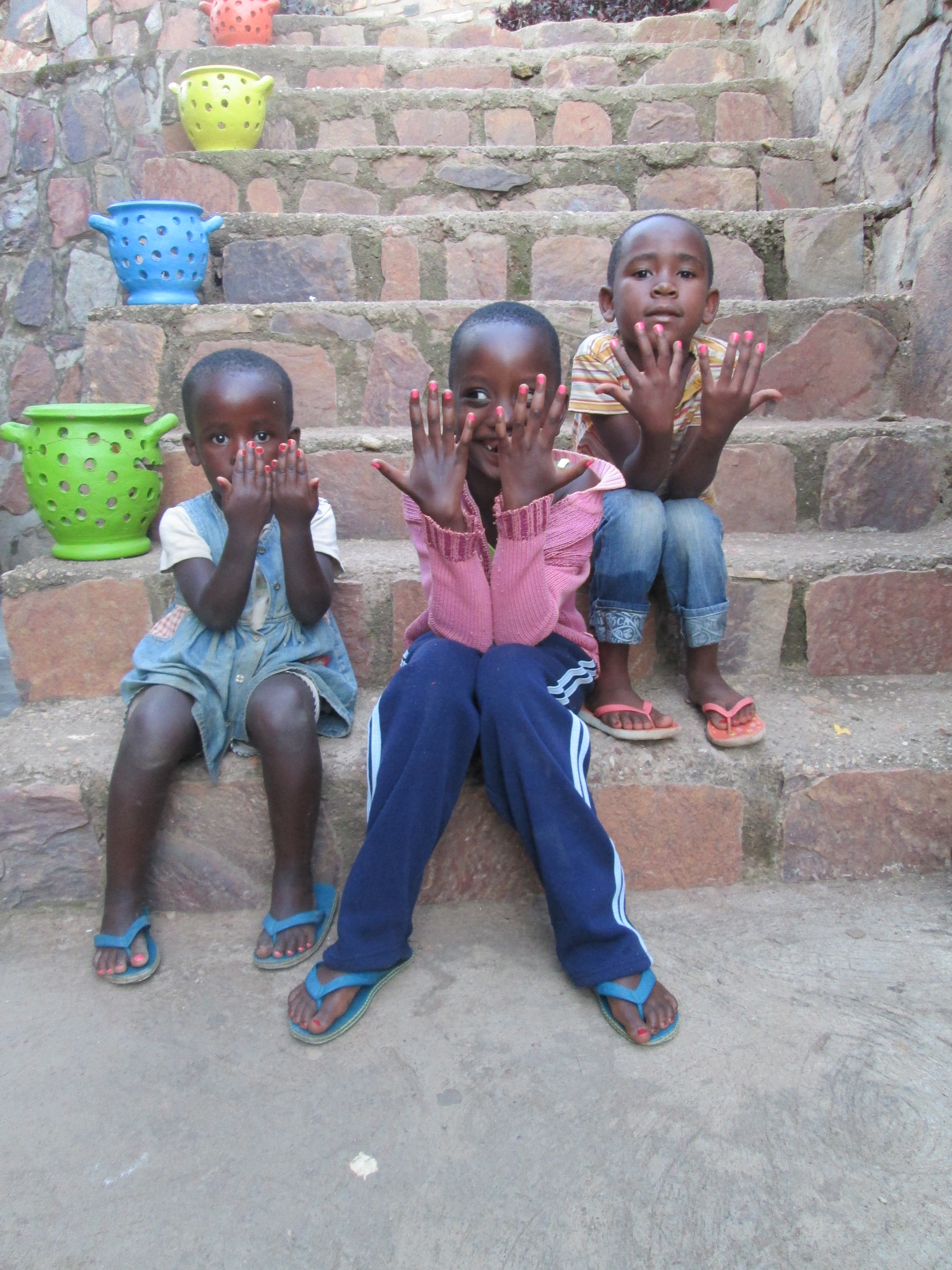 I was standing outside the gates of Ivuka last week taking photos of my laundry hanging on the line against the amazing backdrop of Kigali City and it drew many children to me out of curiosity. Soon they were touching me and hold me hands, asking questions and having photos taken of themselves, which they love seeing on the screen afterward! They noticed my finger nails painted fancy and multicolored they seemed  really interested. I knew I wanted to offer them the experience of having me paint their nails so we went down to my room and got my two bottles of polish.