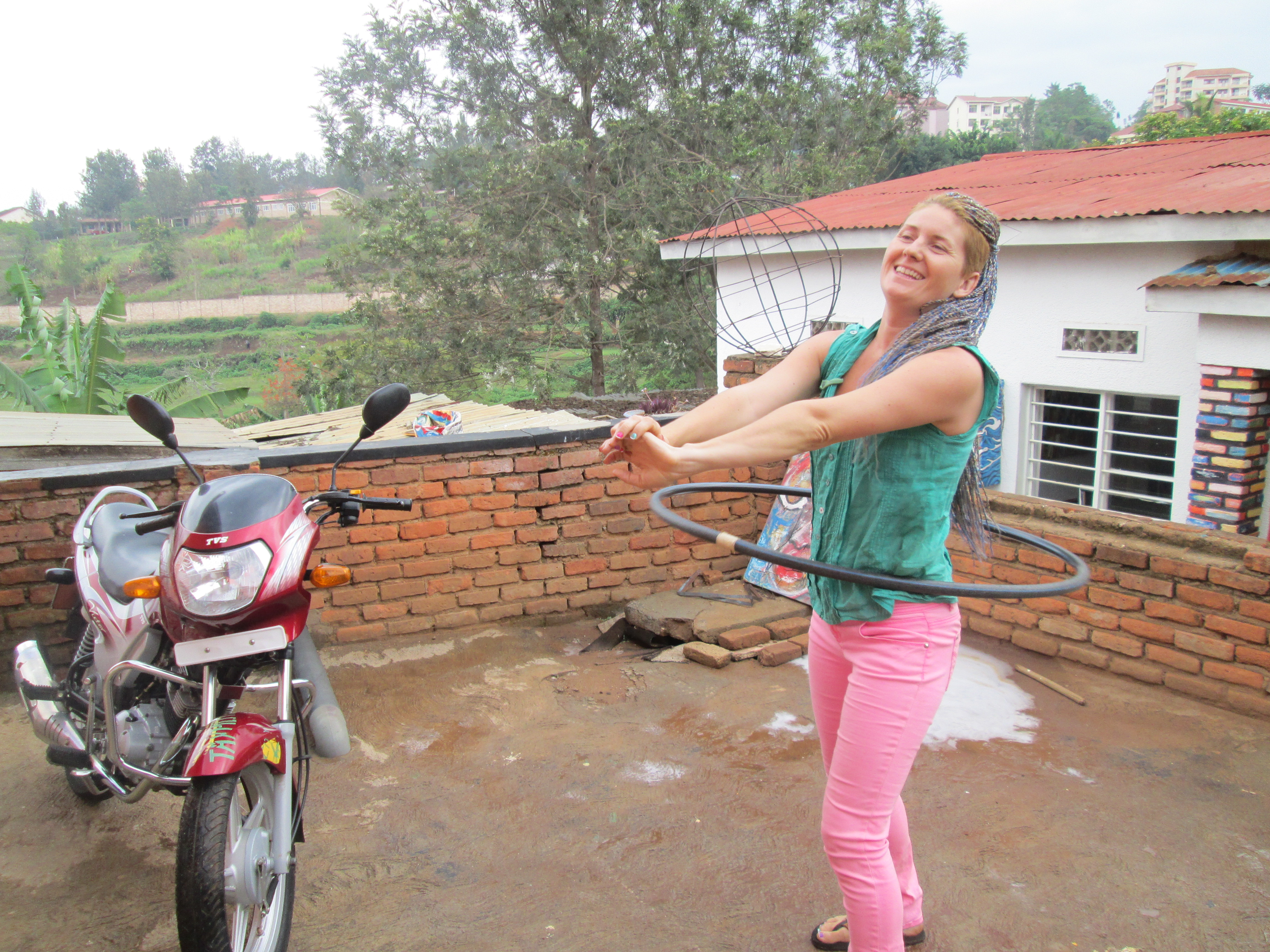 After having been at Ivuka for nearly 3 weeks I ran into the young woman Lizzy who lives on the other side in a different house on the same property. I saw her at Serena Hotel and we started to chat. We had not really seen much of each other or  interacted much since I arrived and this was the first real meeting. It was clear right away that we were a match! Sharing our stories, our journeys and our experiences in Rwanda. She was the one who made the hoola hoop that I found when I arrived at Ivuka! I now have a new partner for the gym and she also has Hoola Hoop knowledge  and has done the leg work for how find supplies to make them in Rwanda, so we have teamed up to get the “LOVE HOOP RWANDA” project started this tuesday!
