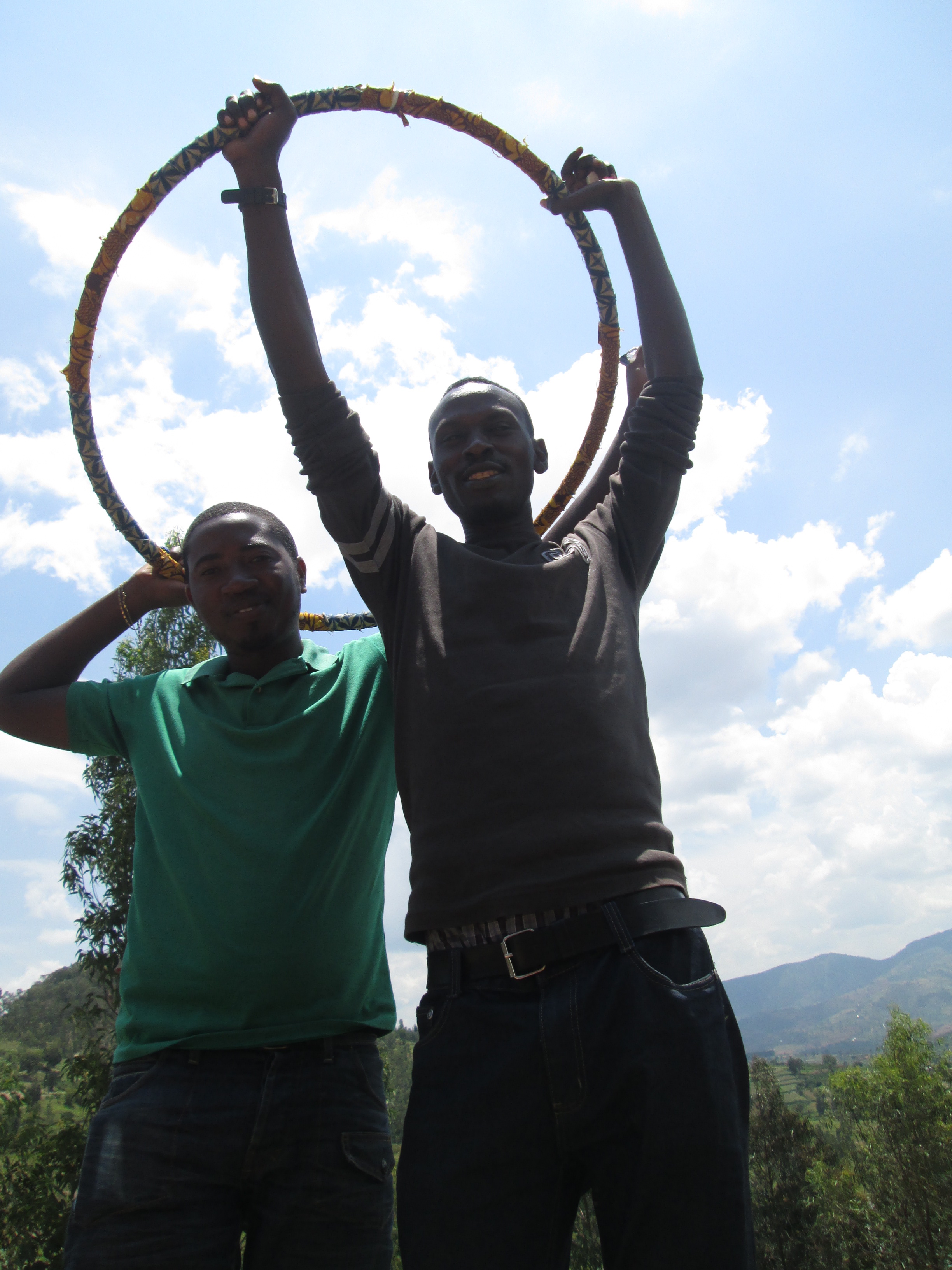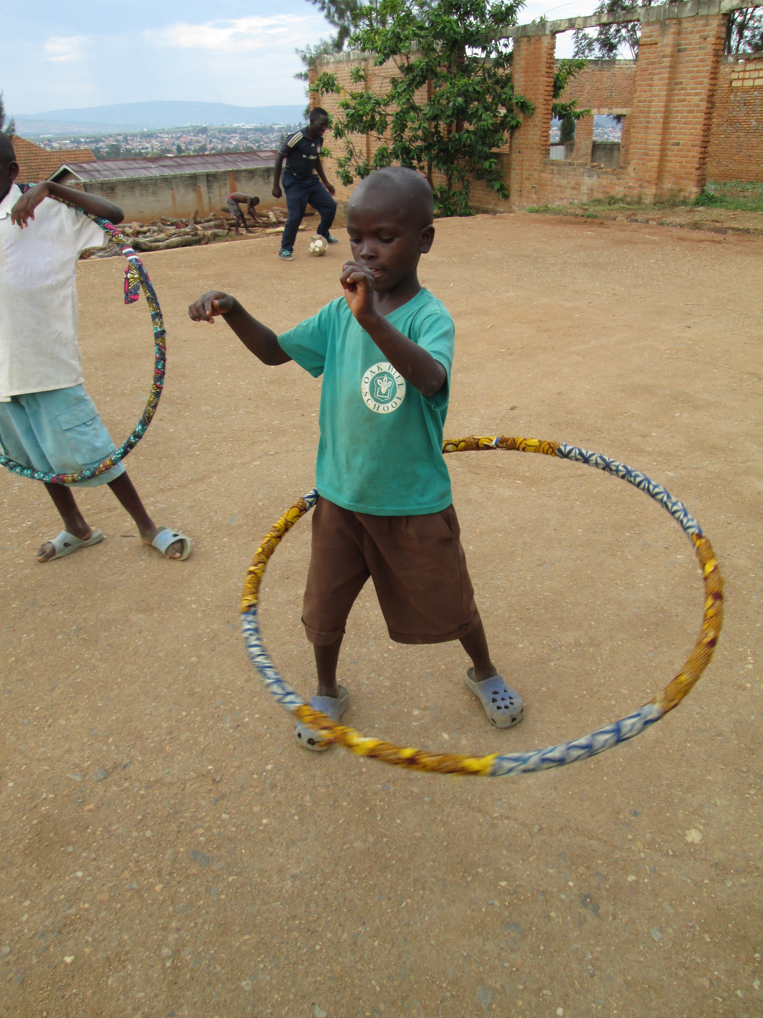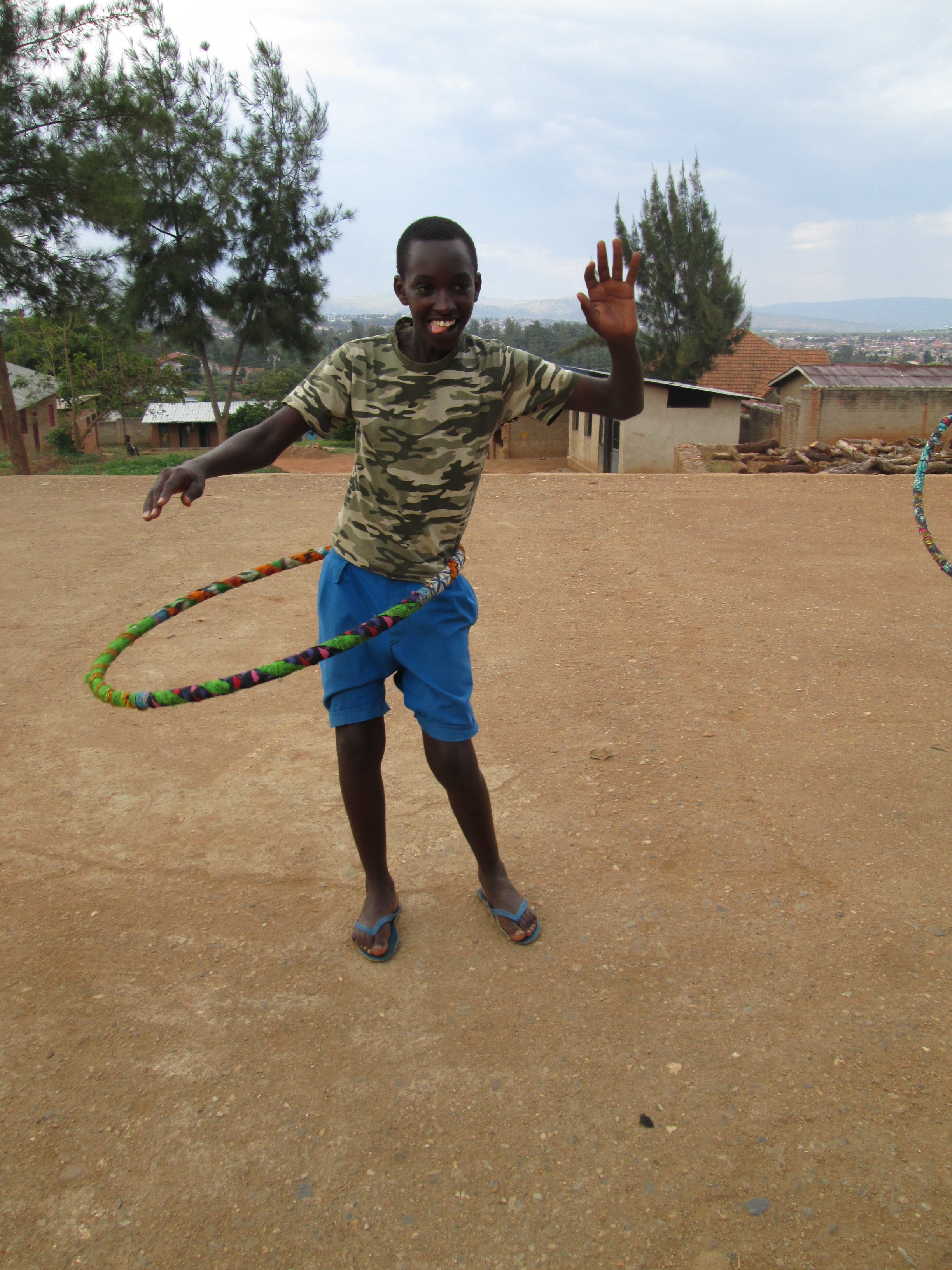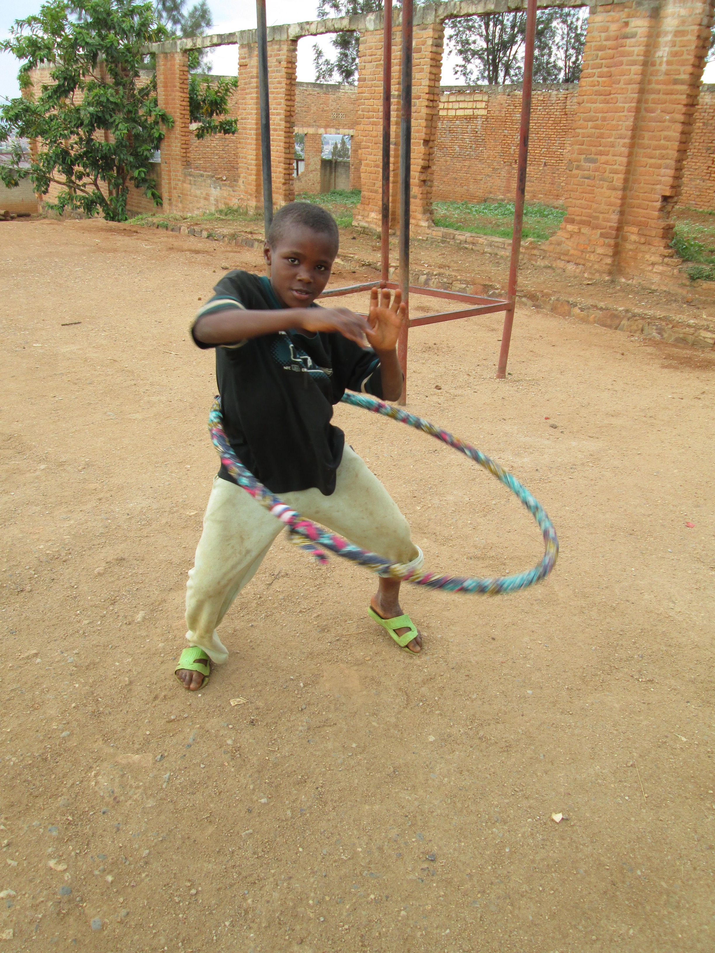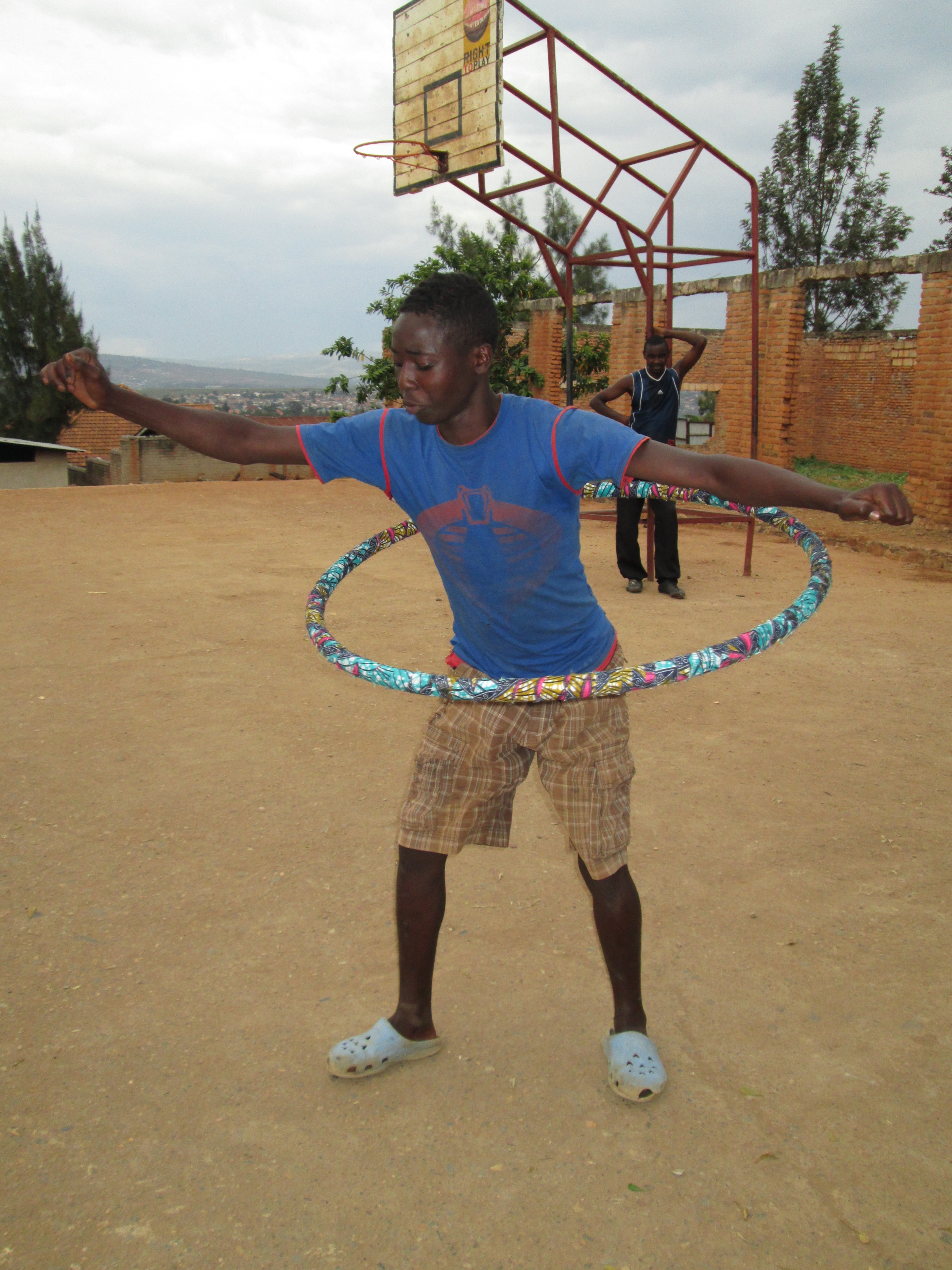 This young man lives in a room with a pile of dirt the size of a VW Beetle, one light bulb hanging from the roof and a thin mattress he shares with Jean Pierre. Yet every night he would bathe just outside my bedroom window and sing as loud as he can with Joy! What an inspiration! As my gift to him when I left Rwanda he received one of the hoops and I instructed him to keep practicing and sharing with others! He was very happy and so was I!