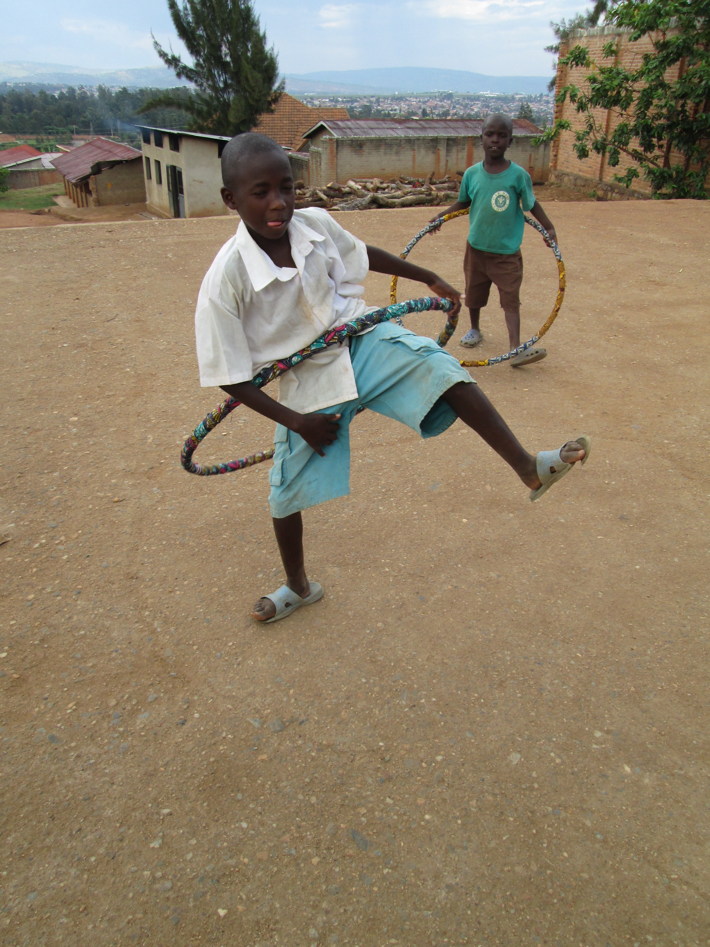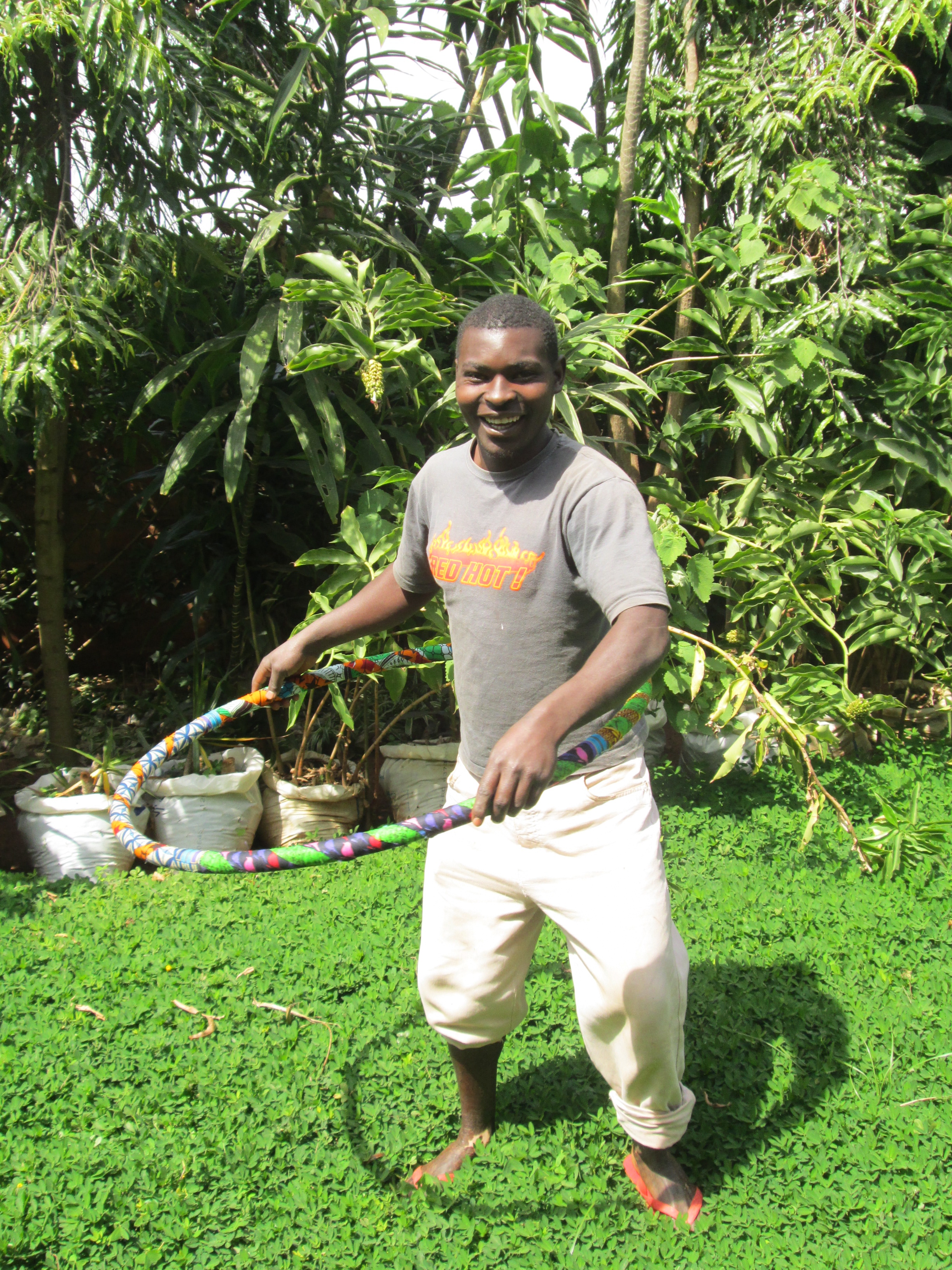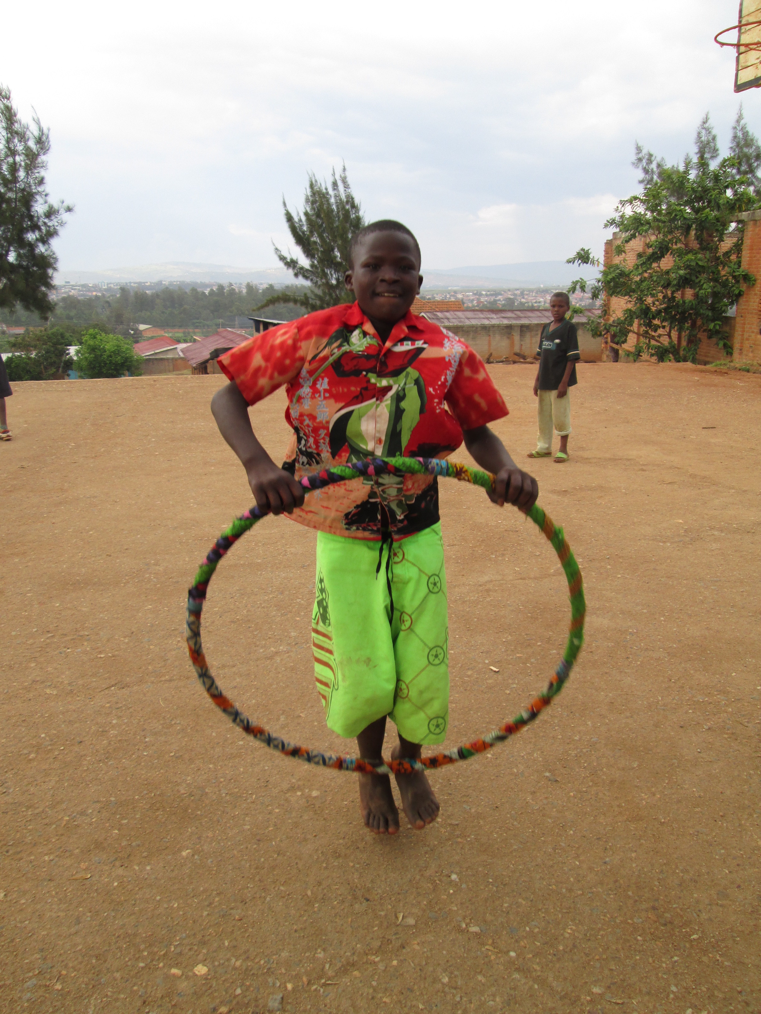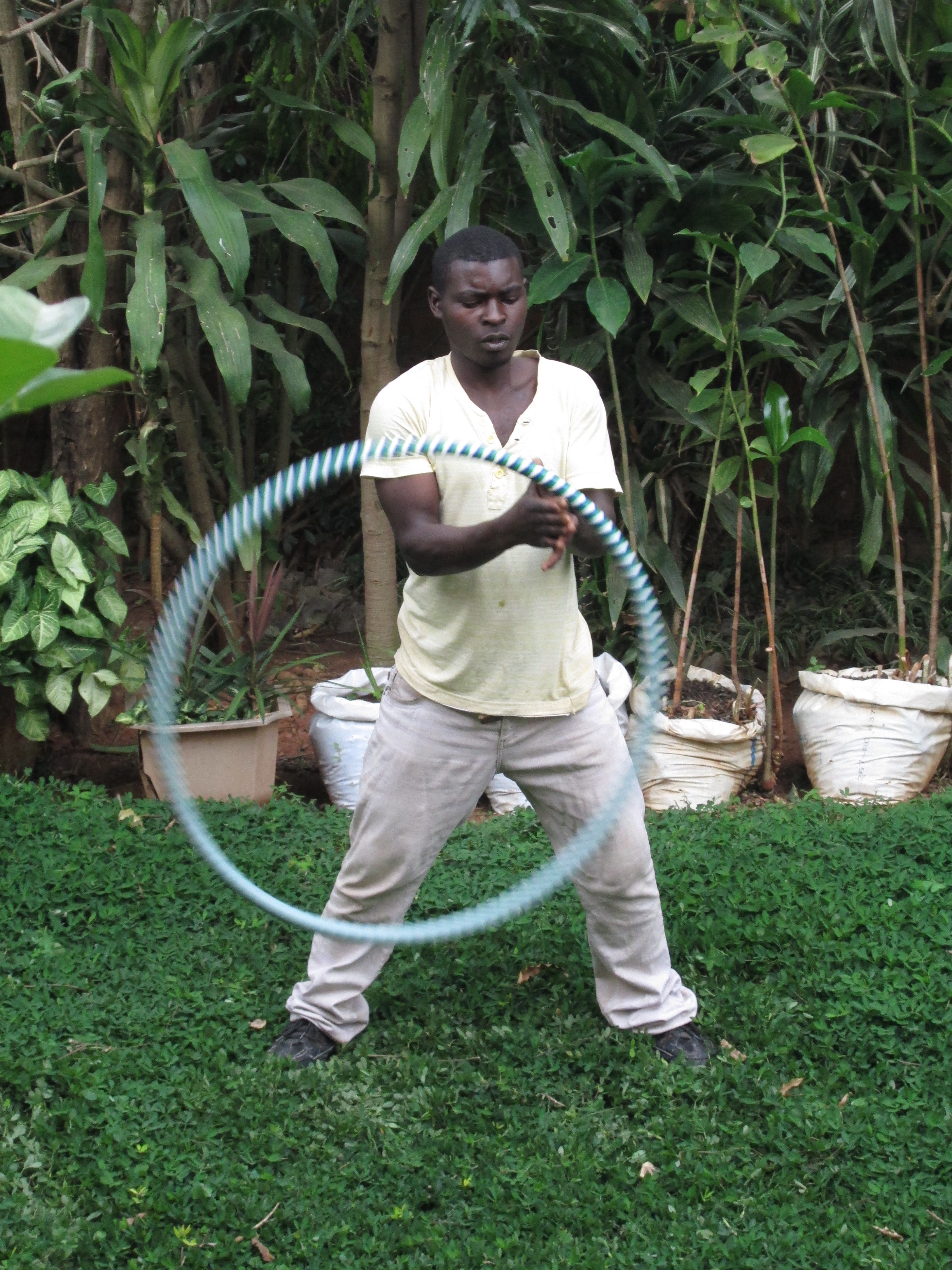 This young man lives in a room with a pile of dirt the size of a VW Beetle, one light bulb hanging from the roof and a thin mattress he shares with Jean Pierre. Yet every night he would bathe just outside my bedroom window and sing as loud as he can with Joy! What an inspiration! As my gift to him when I left Rwanda he received one of the hoops and I instructed him to keep practicing and sharing with others! He was very happy and so was I!
