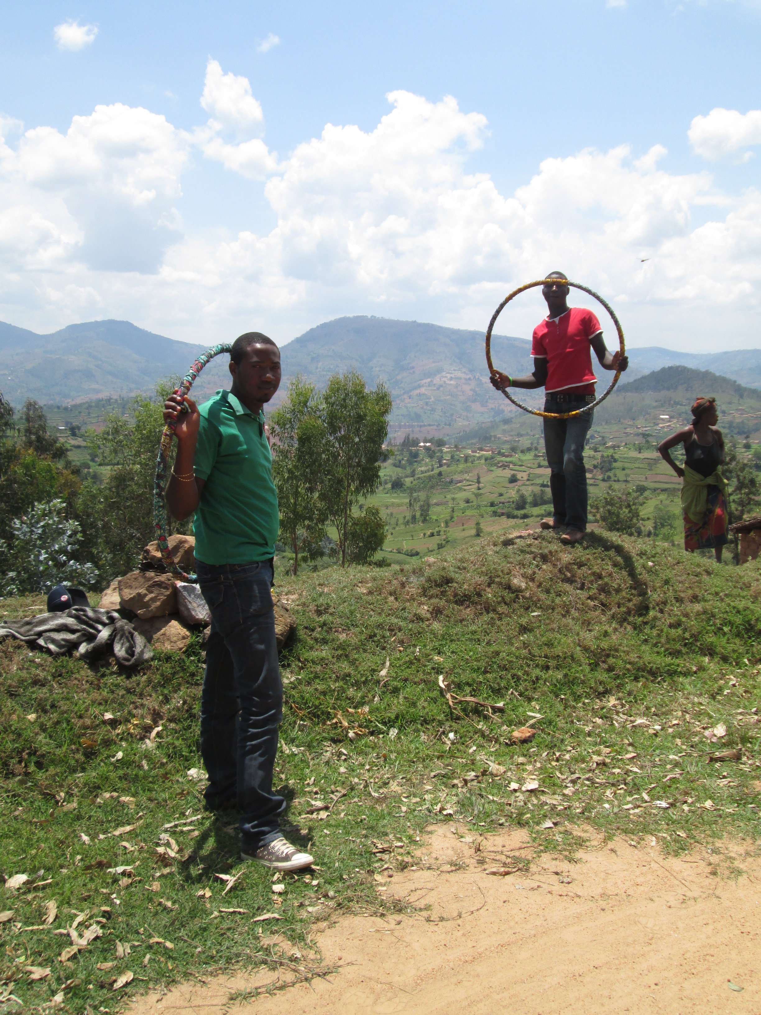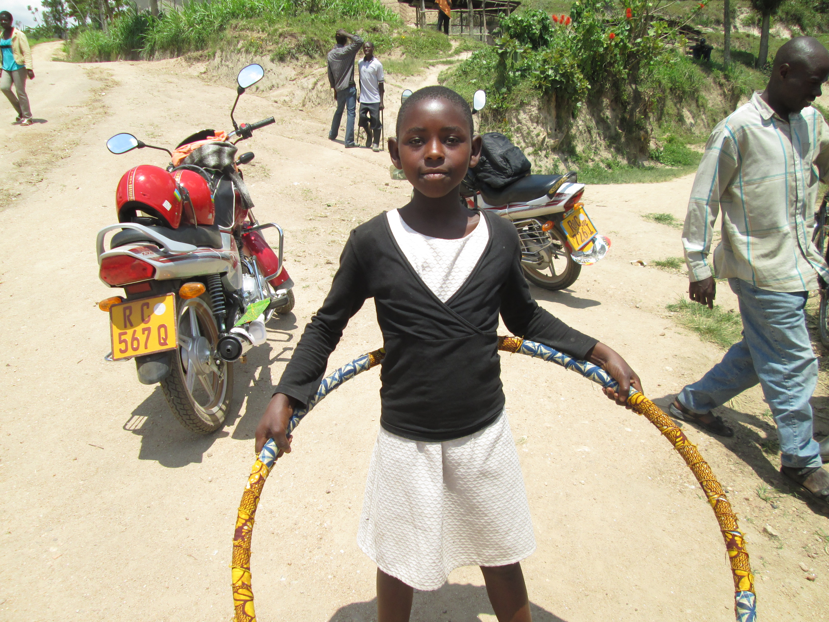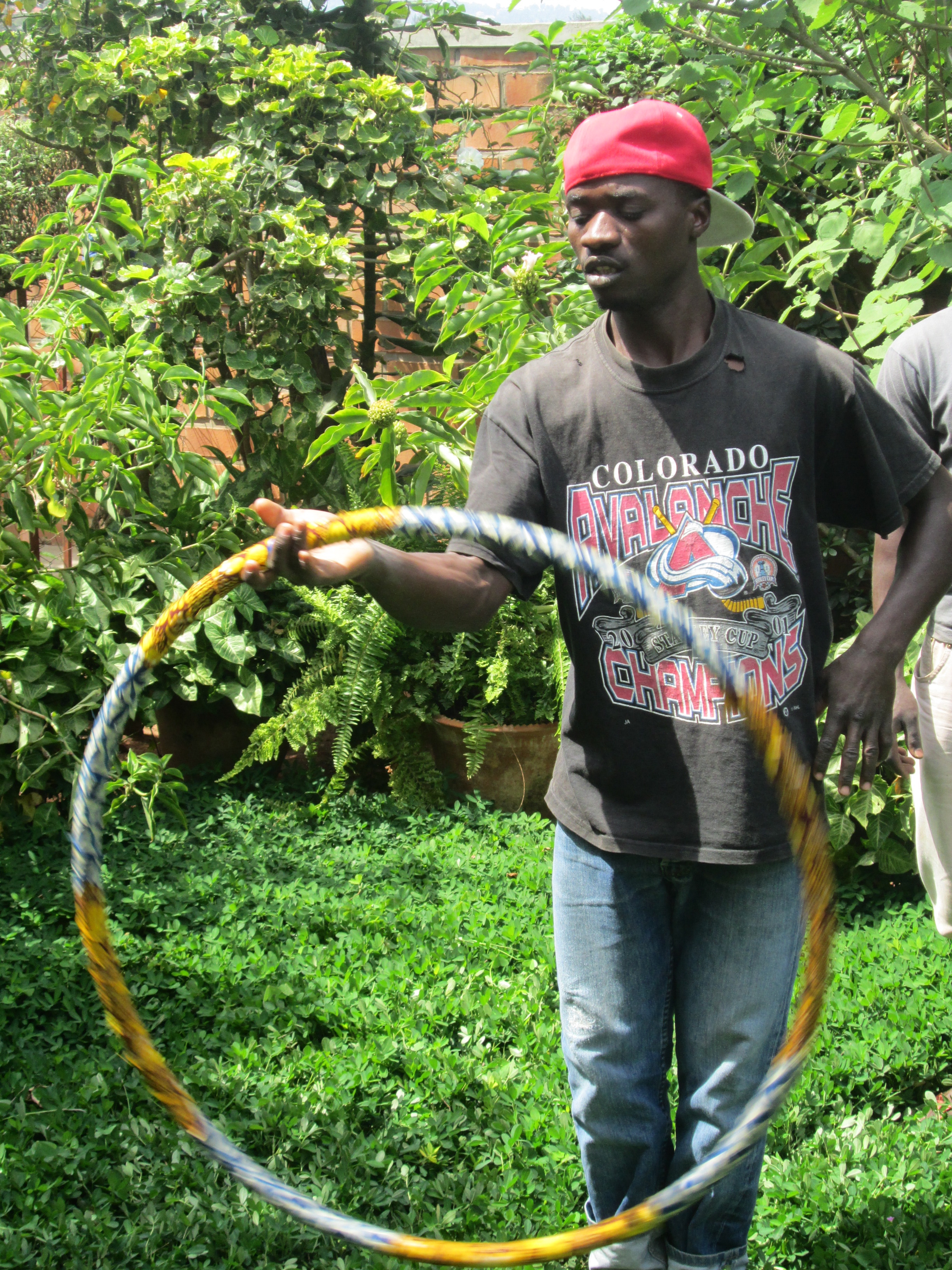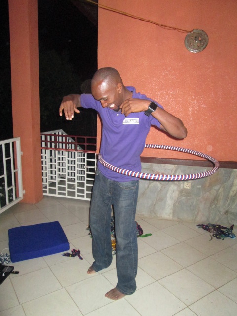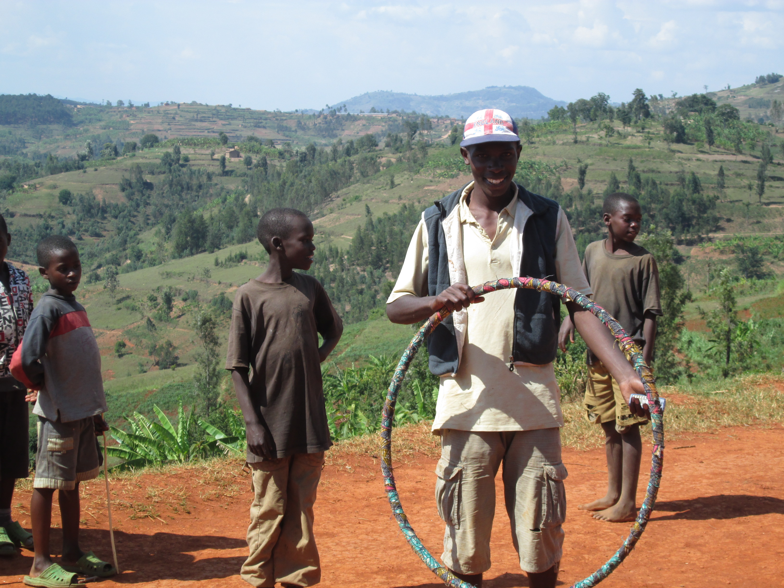 This young man lives in a room with a pile of dirt the size of a VW Beetle, one light bulb hanging from the roof and a thin mattress he shares with Jean Pierre. Yet every night he would bathe just outside my bedroom window and sing as loud as he can with Joy! What an inspiration! As my gift to him when I left Rwanda he received one of the hoops and I instructed him to keep practicing and sharing with others! He was very happy and so was I!