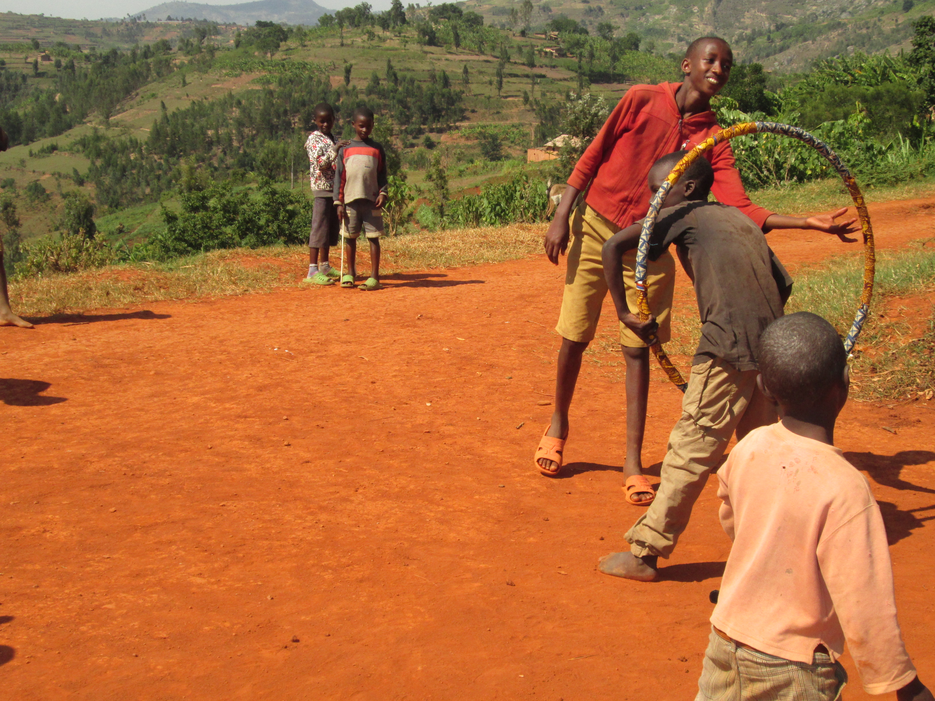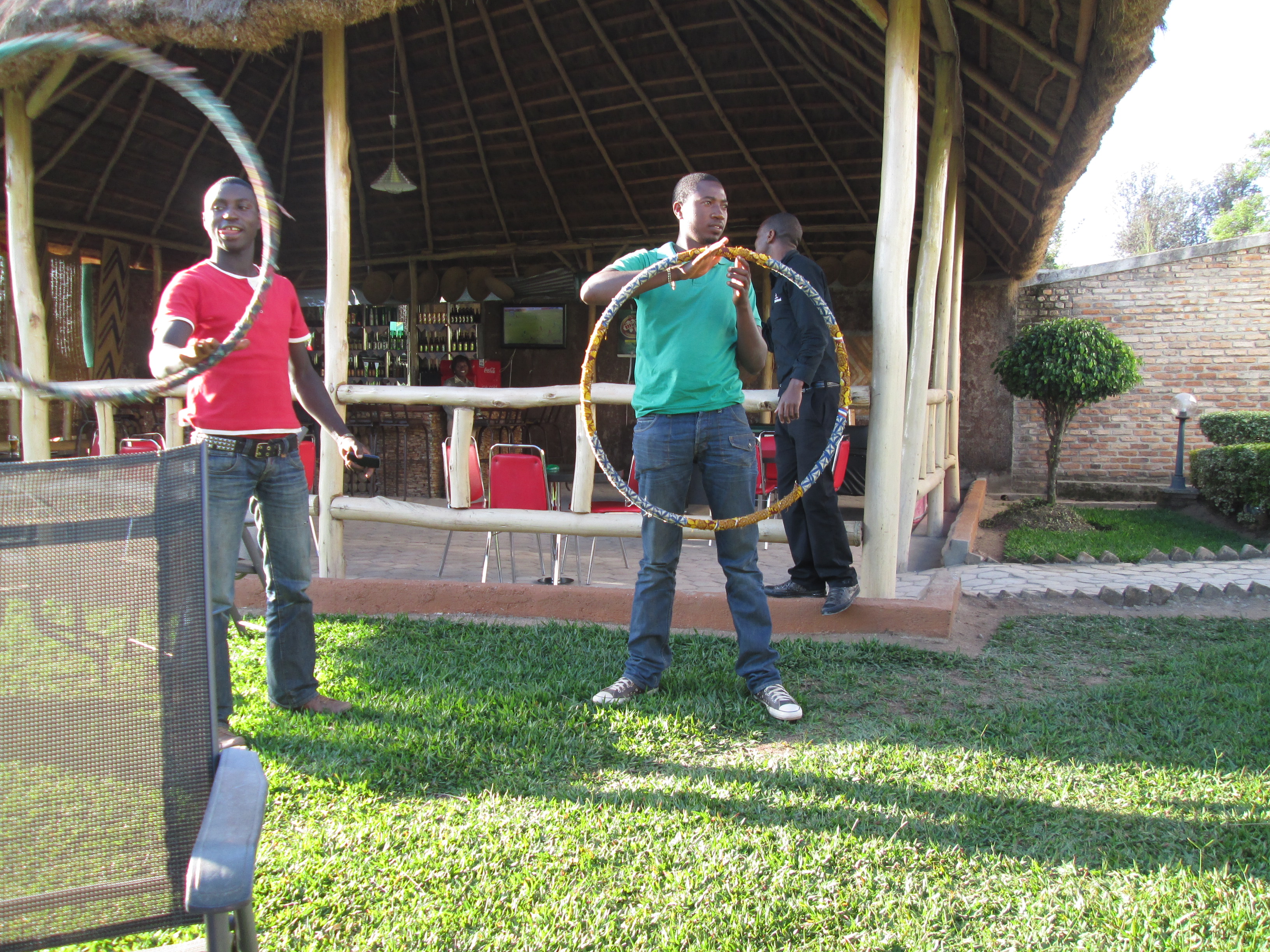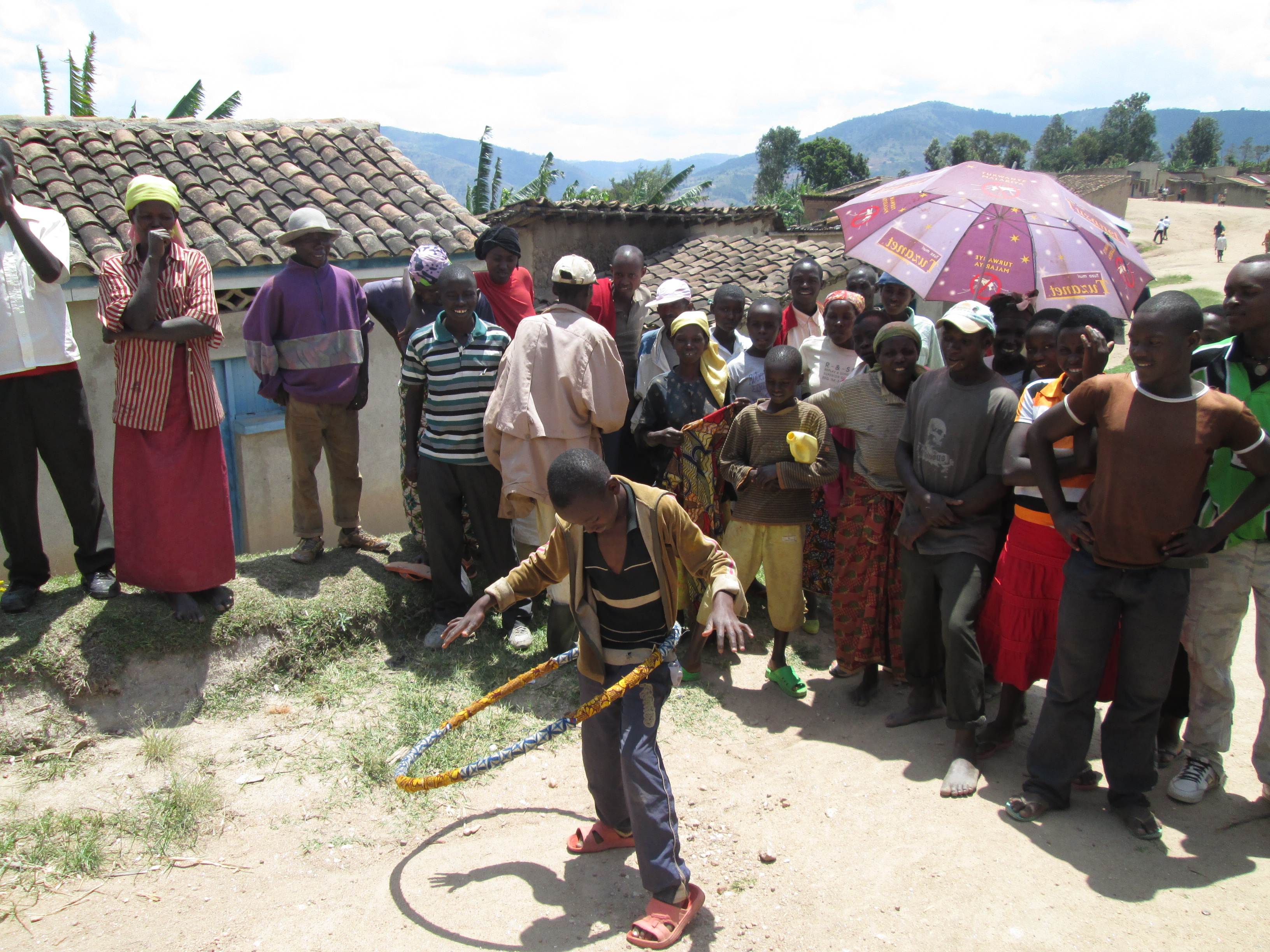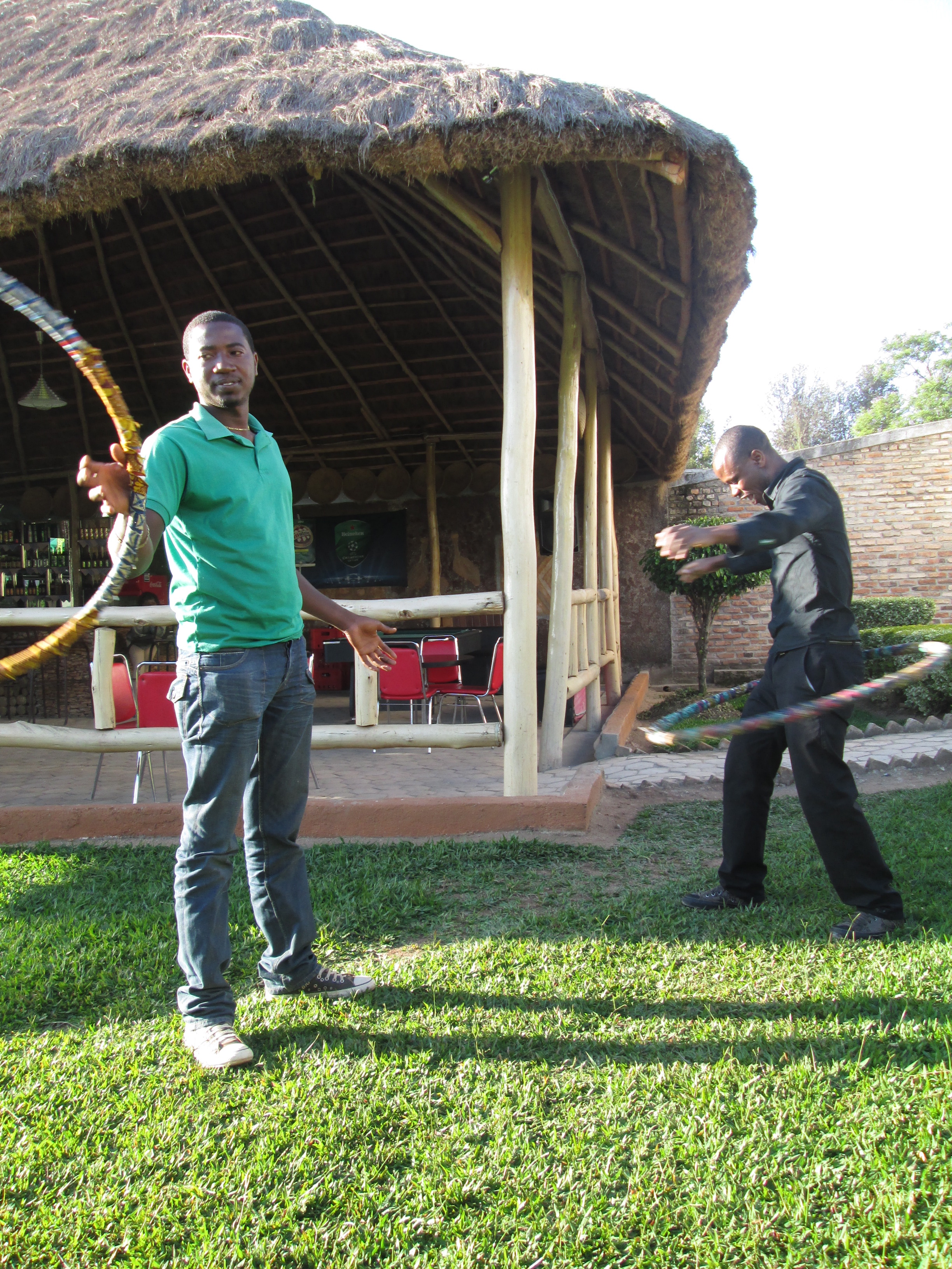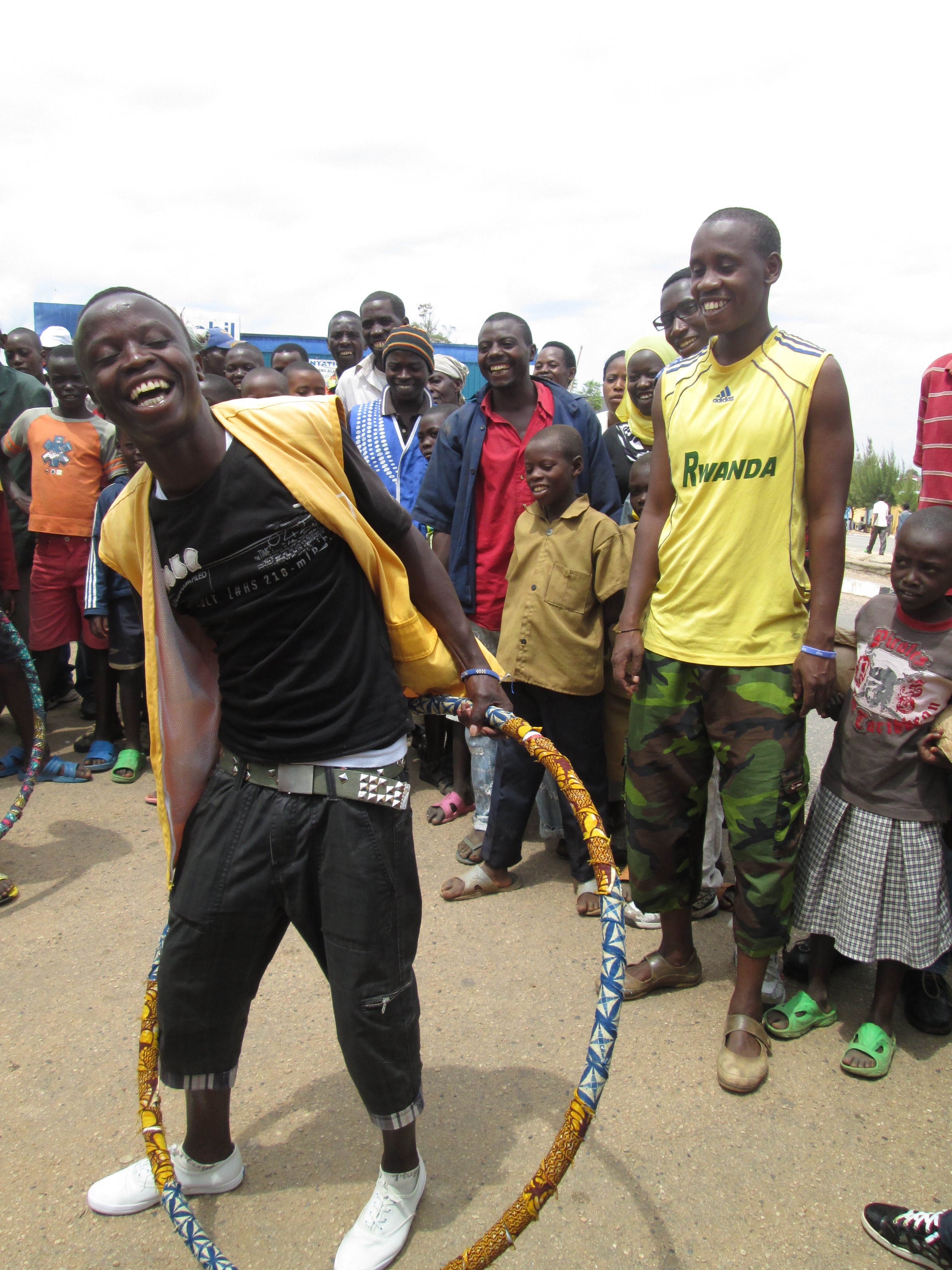 This young man lives in a room with a pile of dirt the size of a VW Beetle, one light bulb hanging from the roof and a thin mattress he shares with Jean Pierre. Yet every night he would bathe just outside my bedroom window and sing as loud as he can with Joy! What an inspiration! As my gift to him when I left Rwanda he received one of the hoops and I instructed him to keep practicing and sharing with others! He was very happy and so was I!