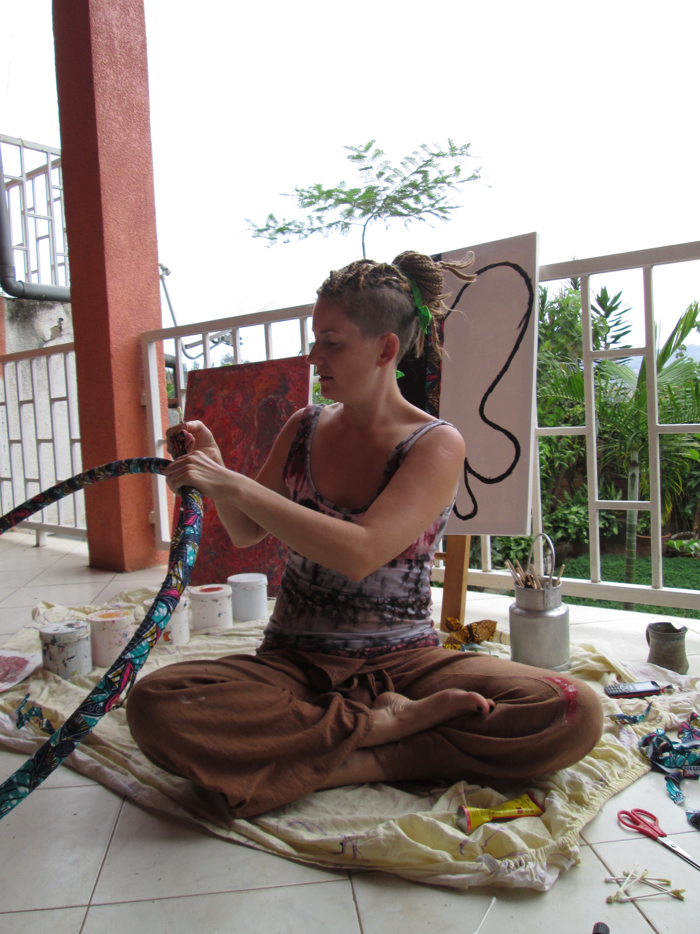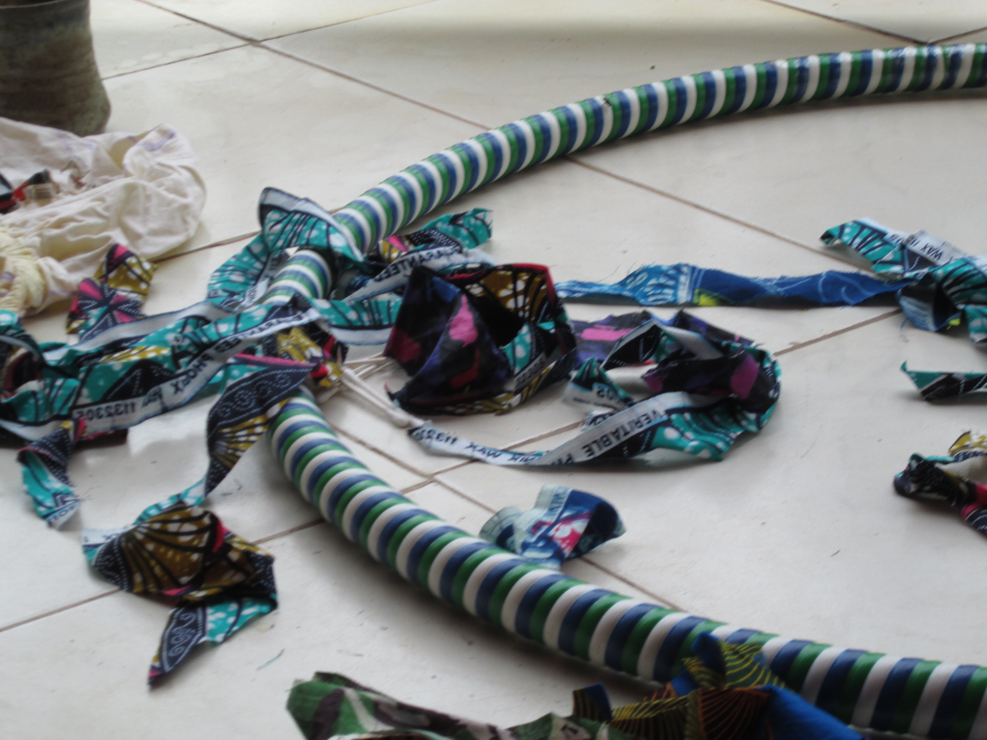 To bring the two cultures together, I wrapped the hoops in Traditional fabric. I was fortunate enough to have a friend, Josephine, at the local market who gave me her fabric scraps for free. The shape of the hoops represents Unity, Oneness, our interconnectedness and the never ending cycle that Love creates when we choose to live fully in our essence.