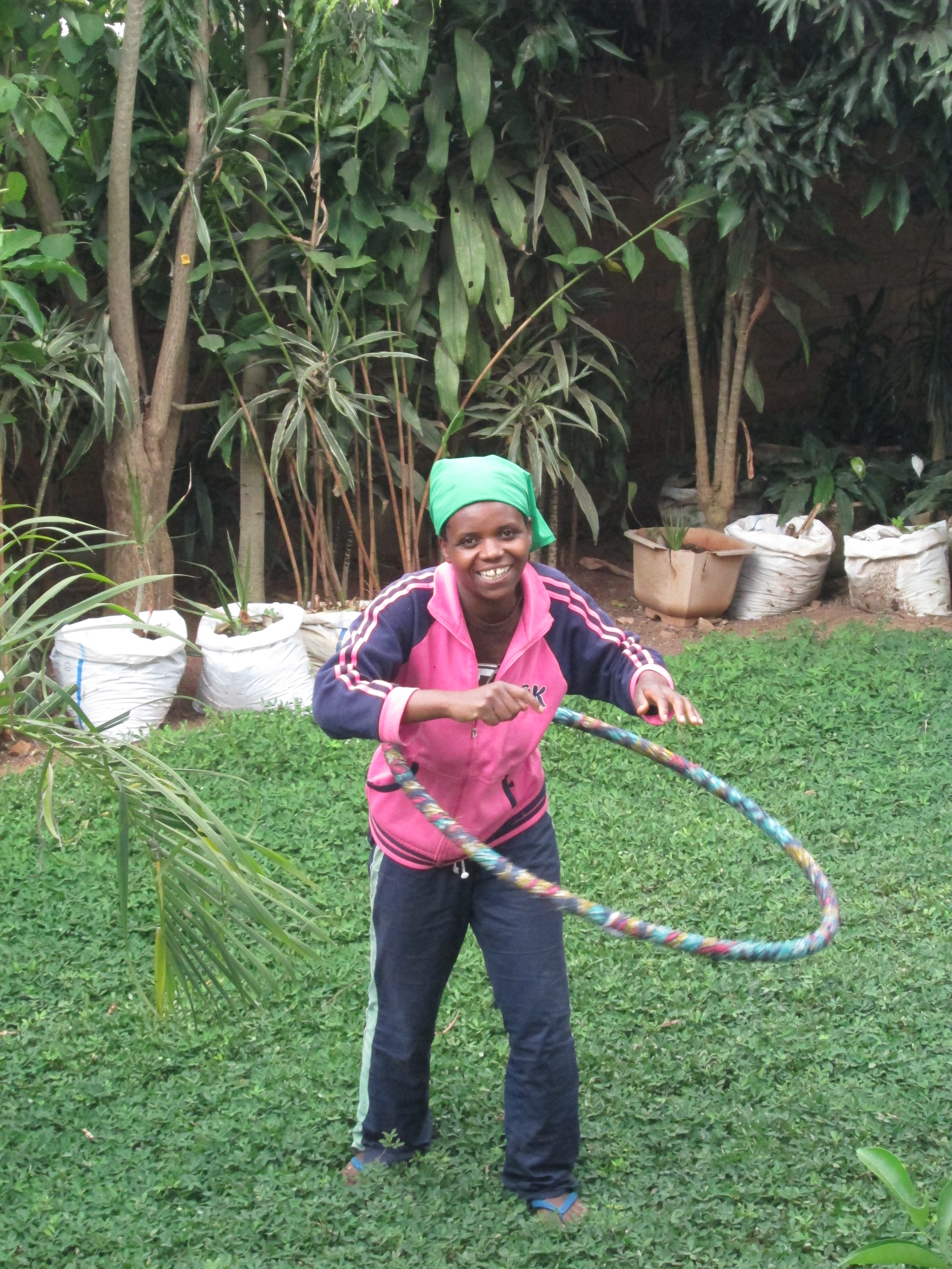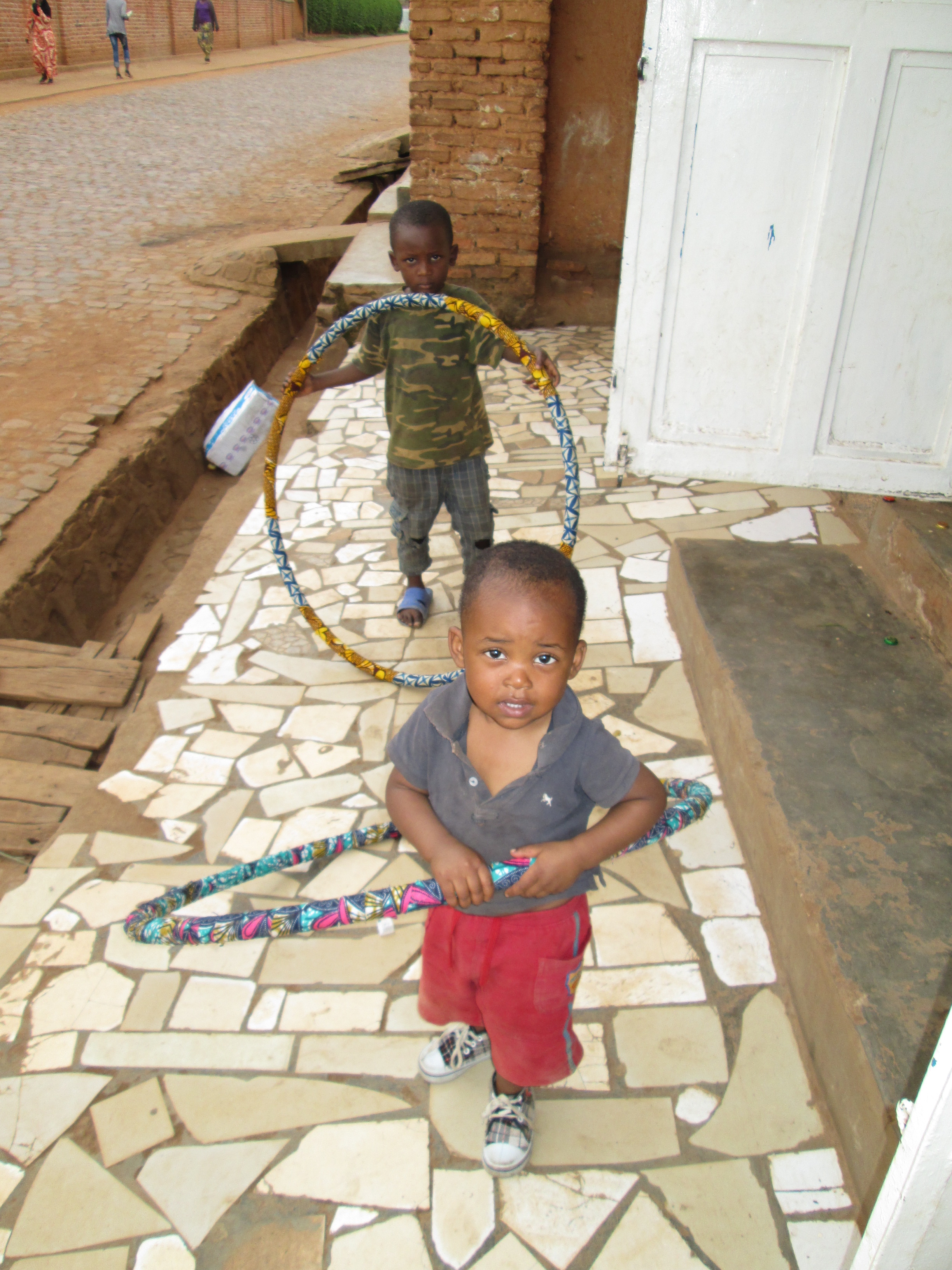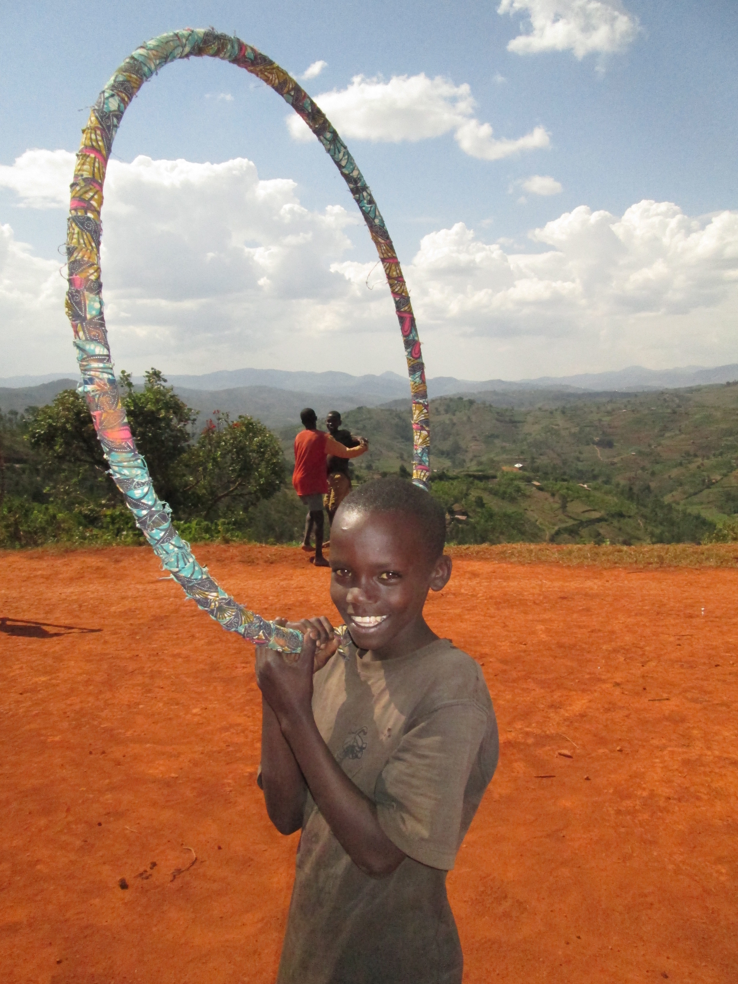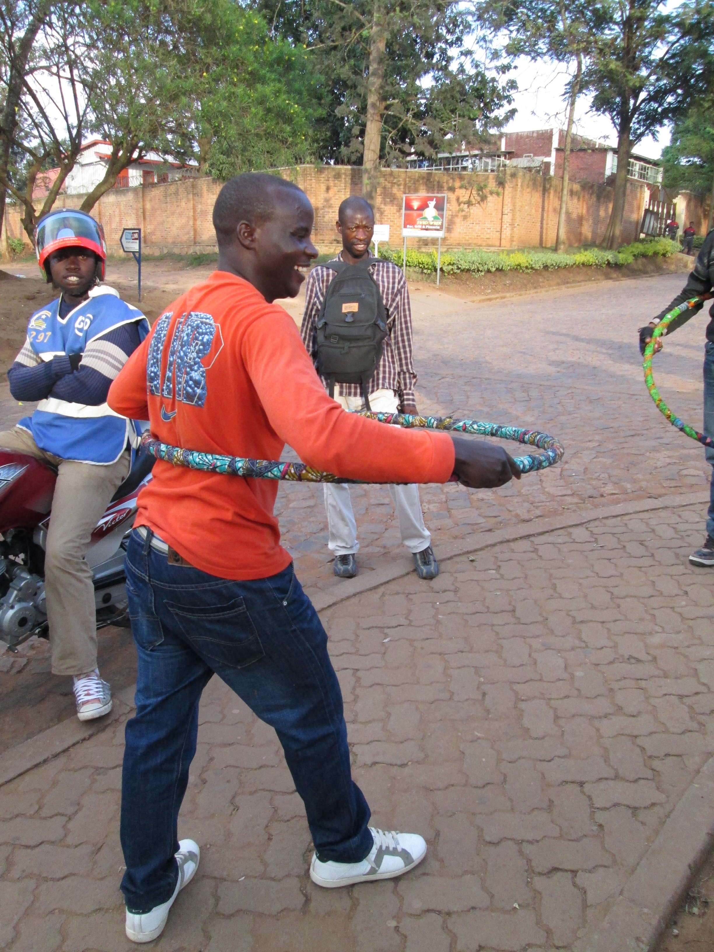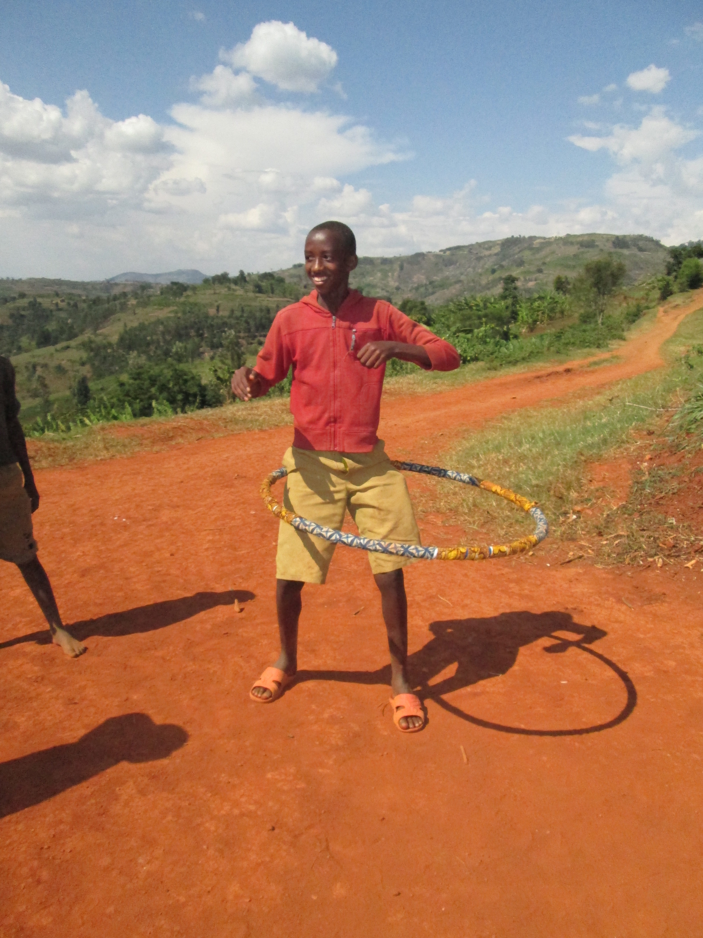 The next step was to take it to the streets! So I ventured out from behind the gates of my home and didn’t have to go far before I was met by the neighborhood kids. I would simply put down my belongings, gesture for them to watch and do a short demo, which always got a smile (usually covered by their hands), a shy turning away but a twinkling in their eye that told me they wanted to try it!! It never failed, once I handed a hoop to them and nodded or said “Yego, yawe….togenda!” (Yes, you….GO!!) they were happy to play with me!!