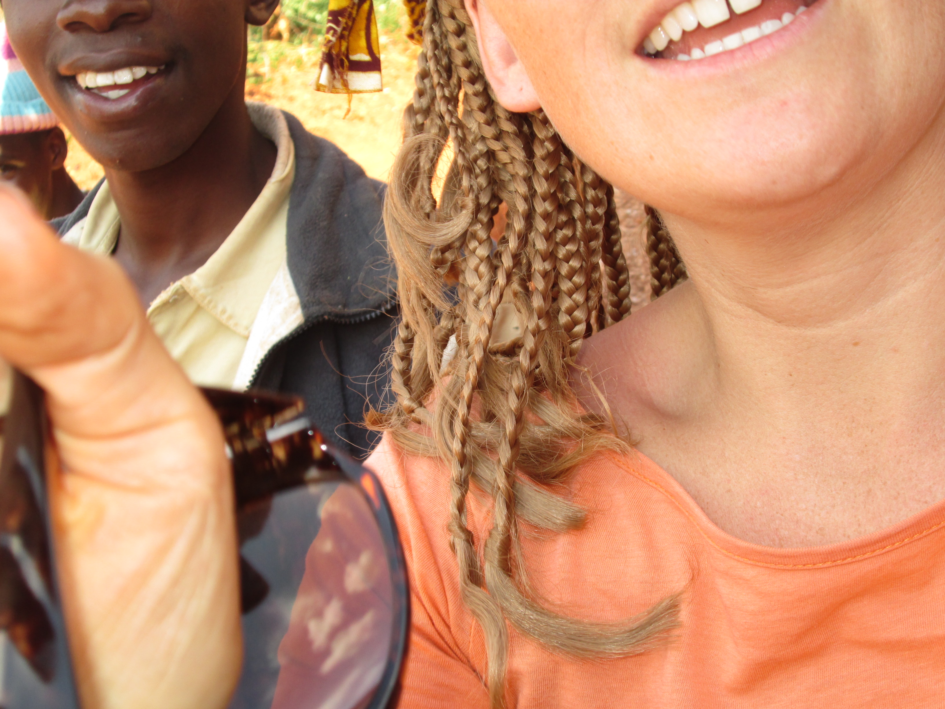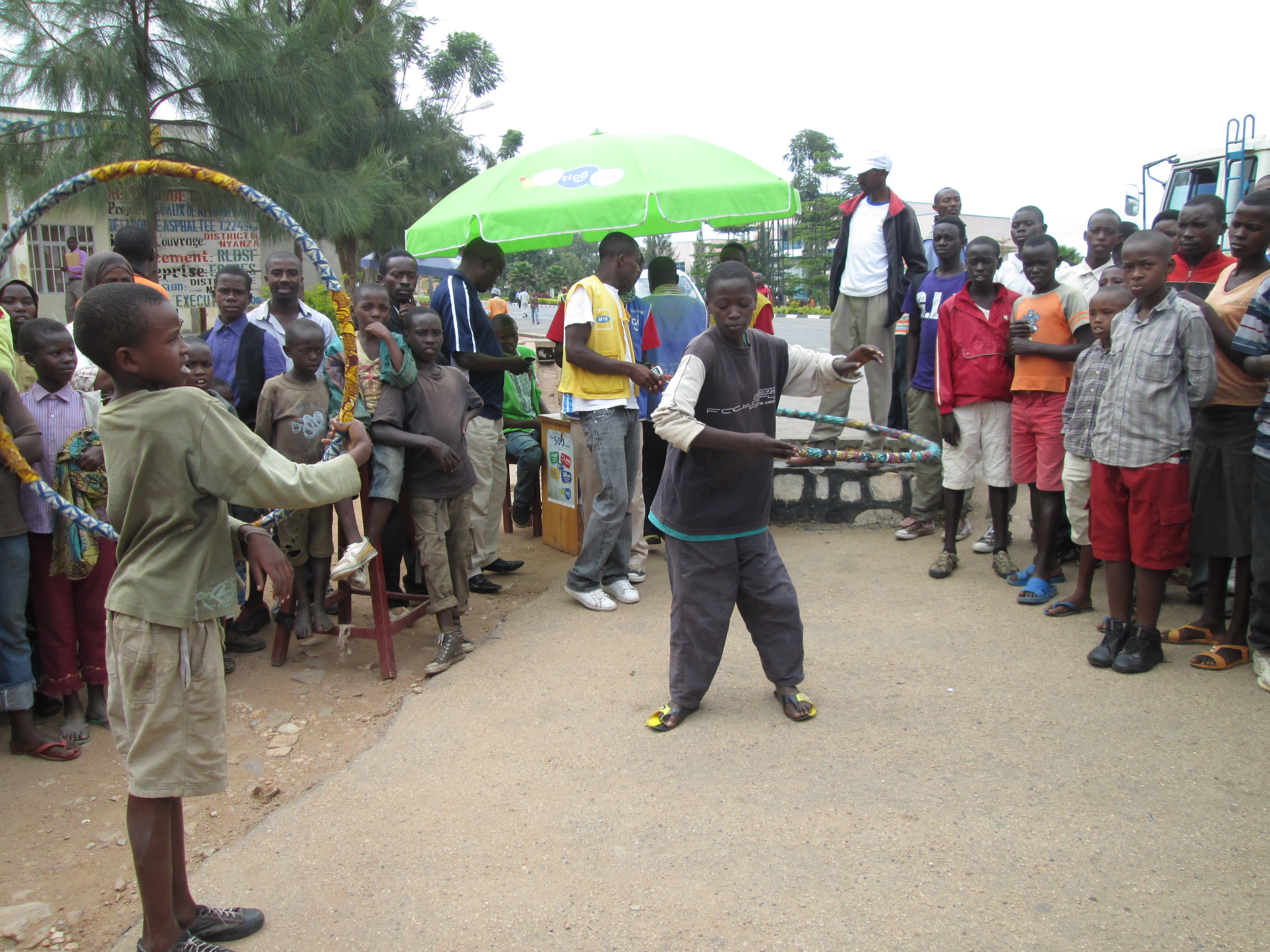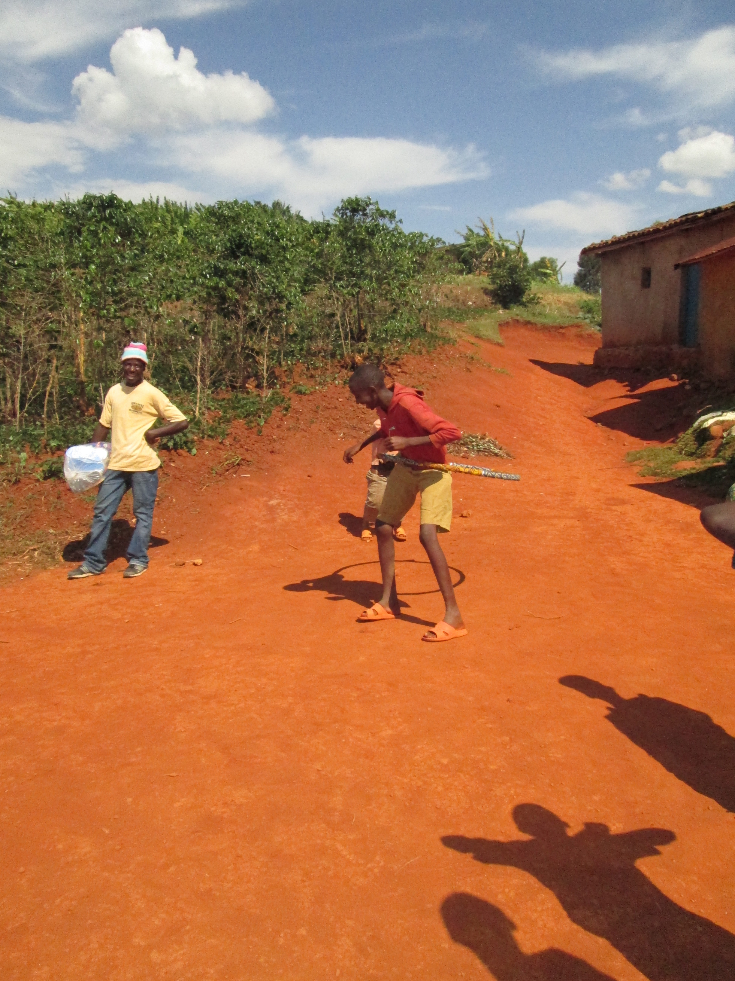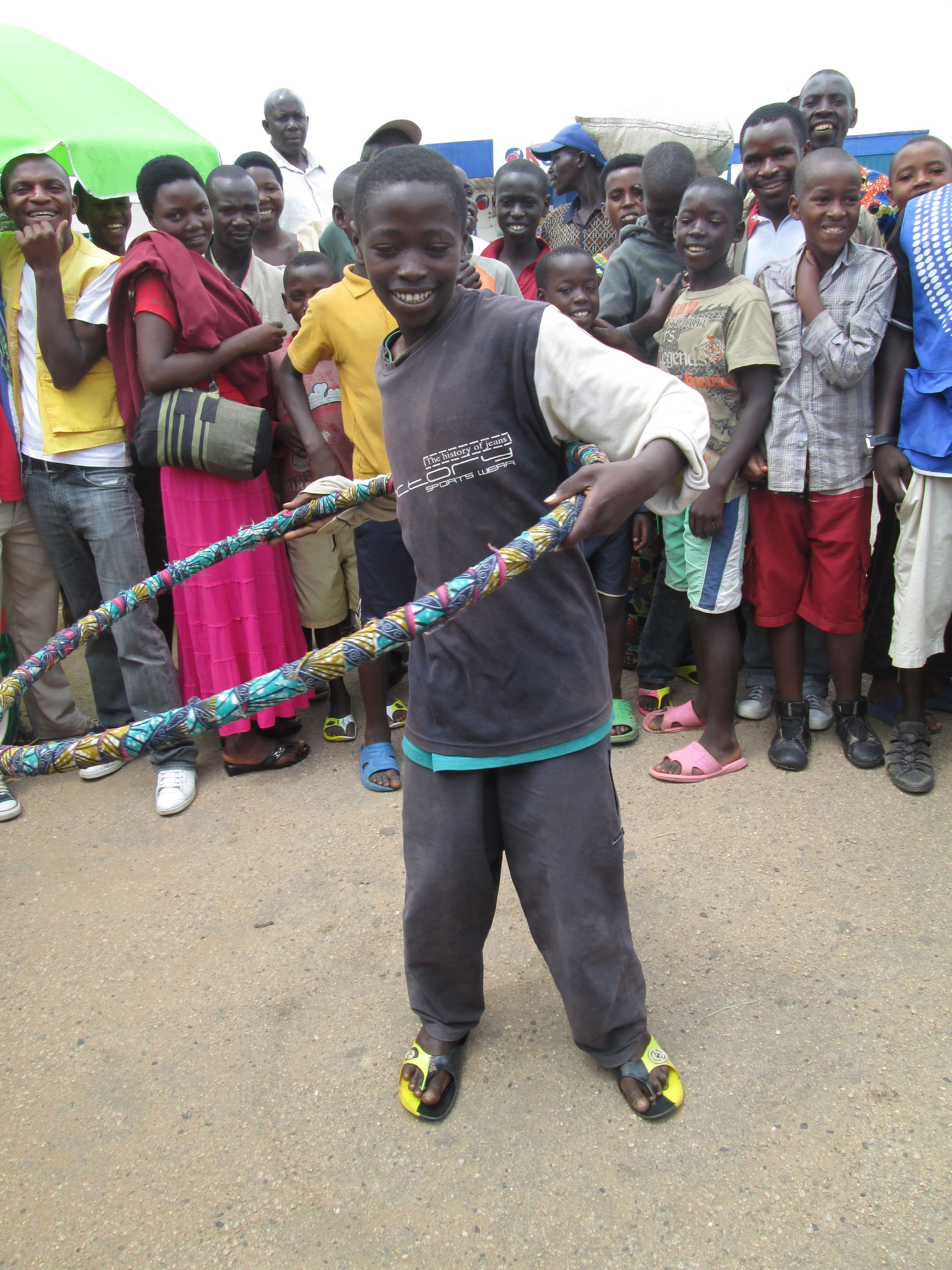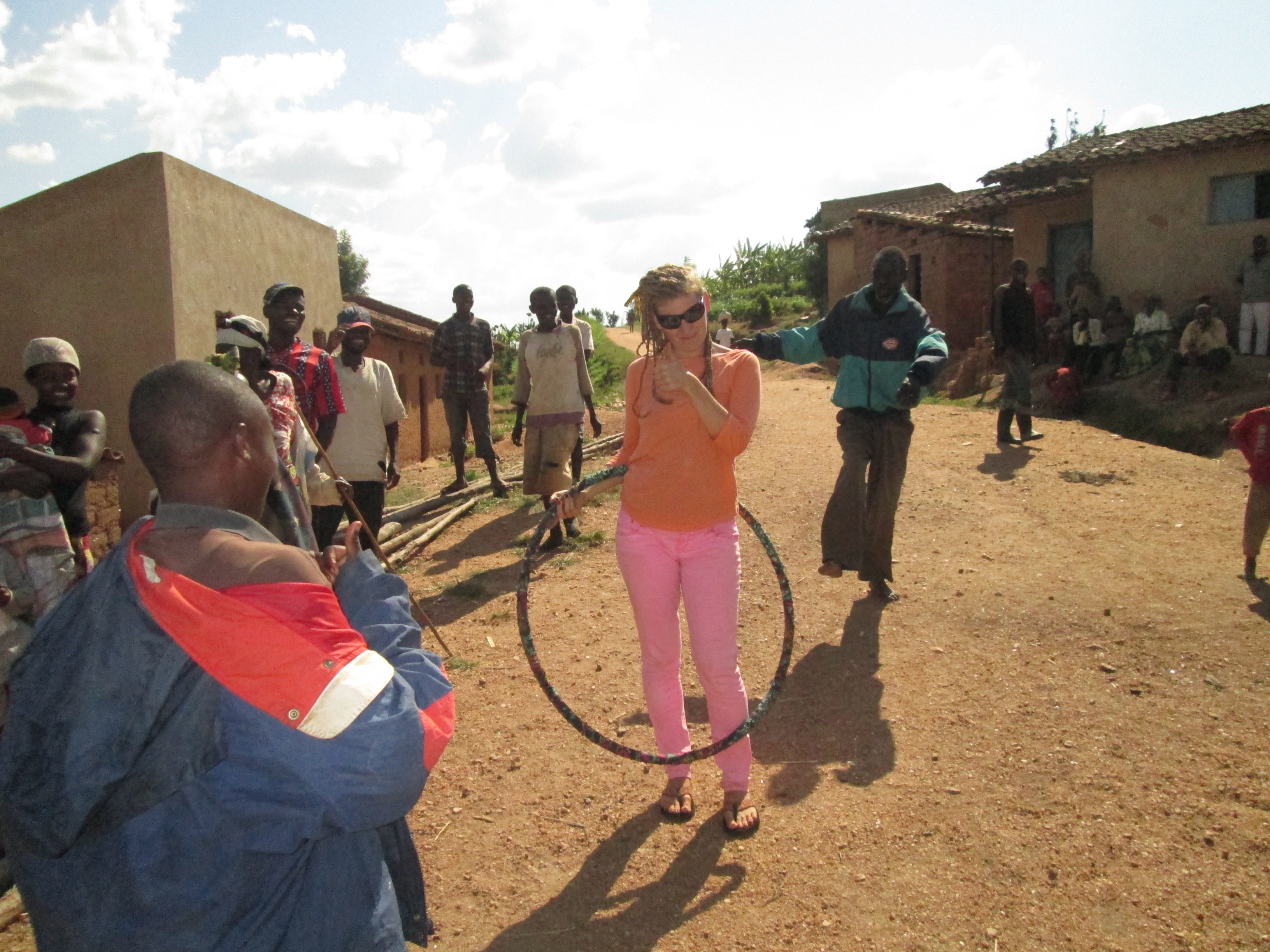 The next step was to take it to the streets! So I ventured out from behind the gates of my home and didn’t have to go far before I was met by the neighborhood kids. I would simply put down my belongings, gesture for them to watch and do a short demo, which always got a smile (usually covered by their hands), a shy turning away but a twinkling in their eye that told me they wanted to try it!! It never failed, once I handed a hoop to them and nodded or said “Yego, yawe….togenda!” (Yes, you….GO!!) they were happy to play with me!!