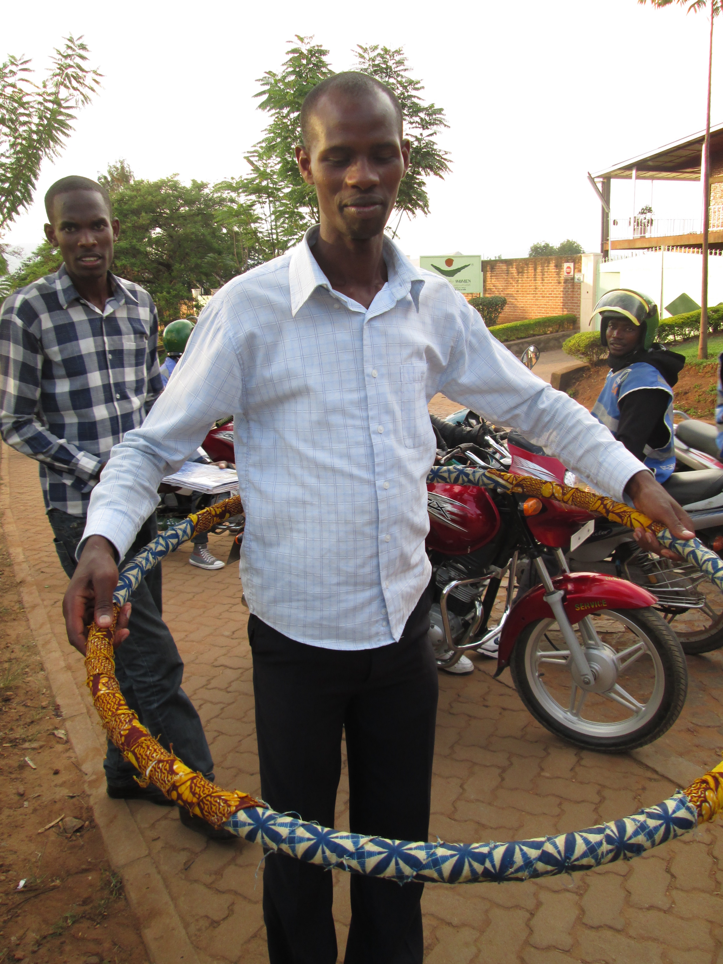 I began with trying to find all the parts needed to build my own hoops, which turned out to be nearly impossible and I was feeling like it may not be possible to make the hoops I needed. One night, I was in the local 24hr Nakumatt, the Rwandan equiviliant to Walmart, and there they were – Awesome pre-made hoops! This was such a surprise and totally unexpected – It was meant to be! I bought as many as I thought I could carry home on a Moto at 11pm! I bought a tube of rubber cement (sort of), Q-tips and went home with a huge grin on my face!